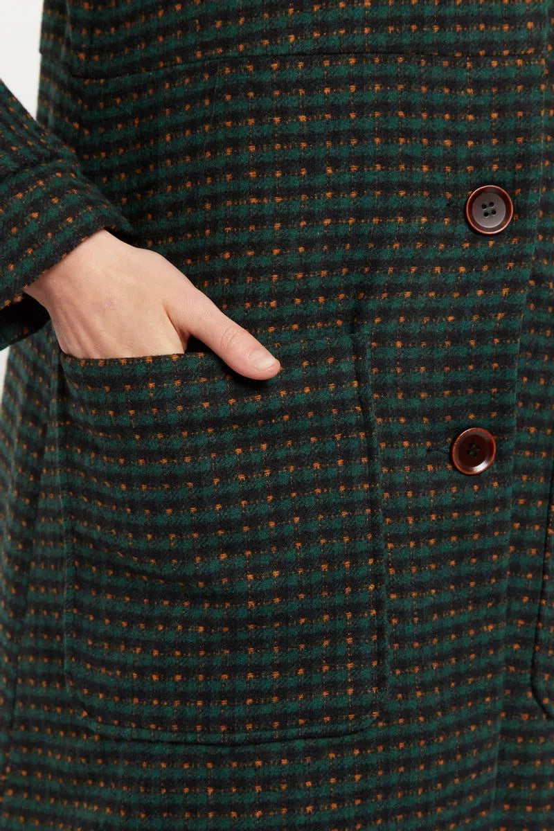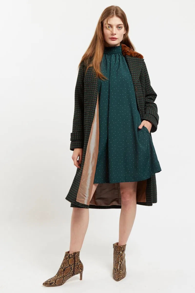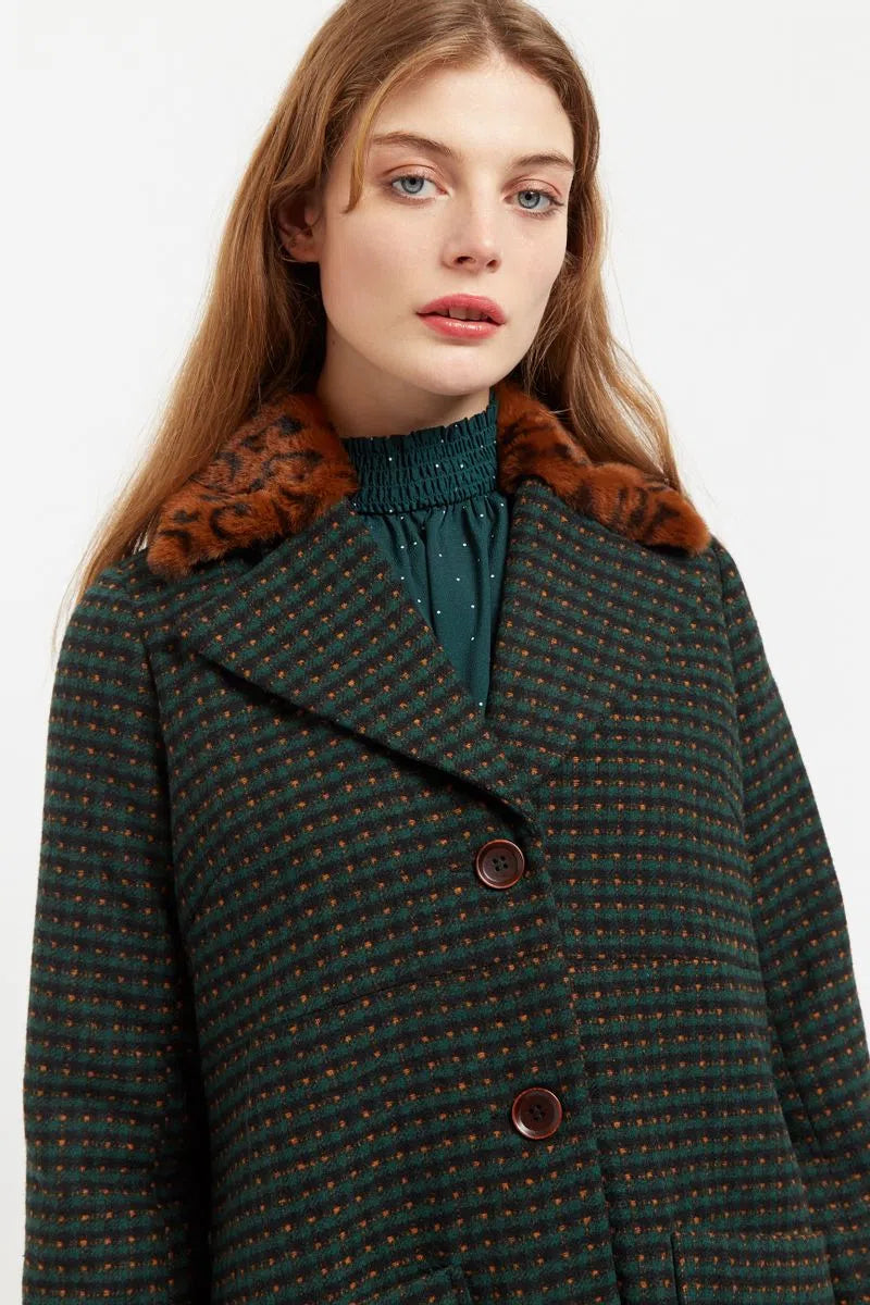 Roksana the reimagined country coat crafted in a wool rich check with luxe shot iridescent lining. Features an oh so soft faux leopard fur collar an deep inverted pleated back to give the coat that all important swing!