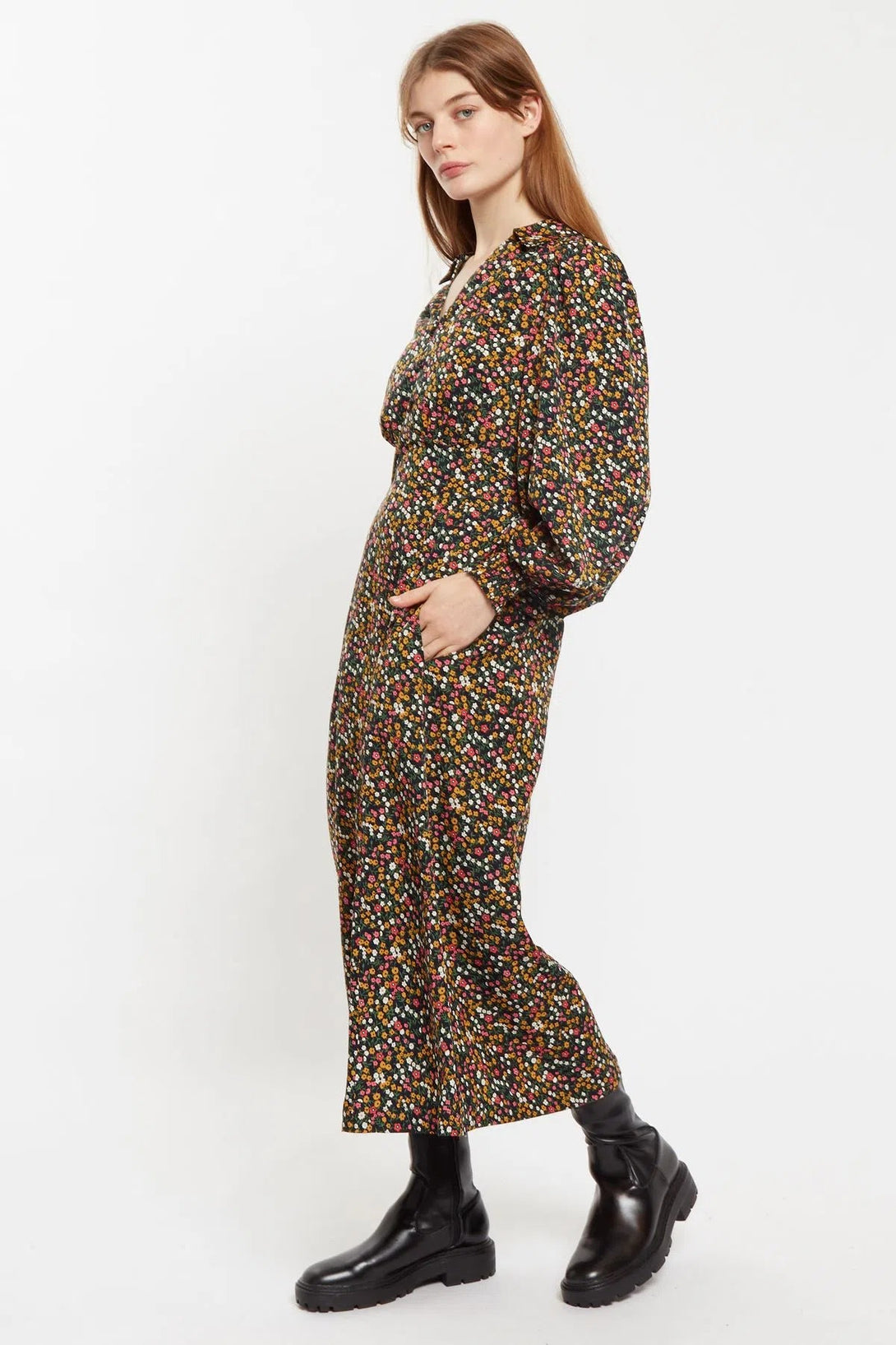 We are all a little in love with Jussi just because she looks so good on everyone! Featuring a V neck open collar flattering neckline, gathered front and back yoke, generously wide sleeves with shirred cuffs, shirred elastic back waist for definition and comfort, self covered buttons, side seam zip to ensure ease when wearing and of course our signature side seam pockets. Crafted in a black based ditsy print print this midi dress is just so adaptable for any occasion.