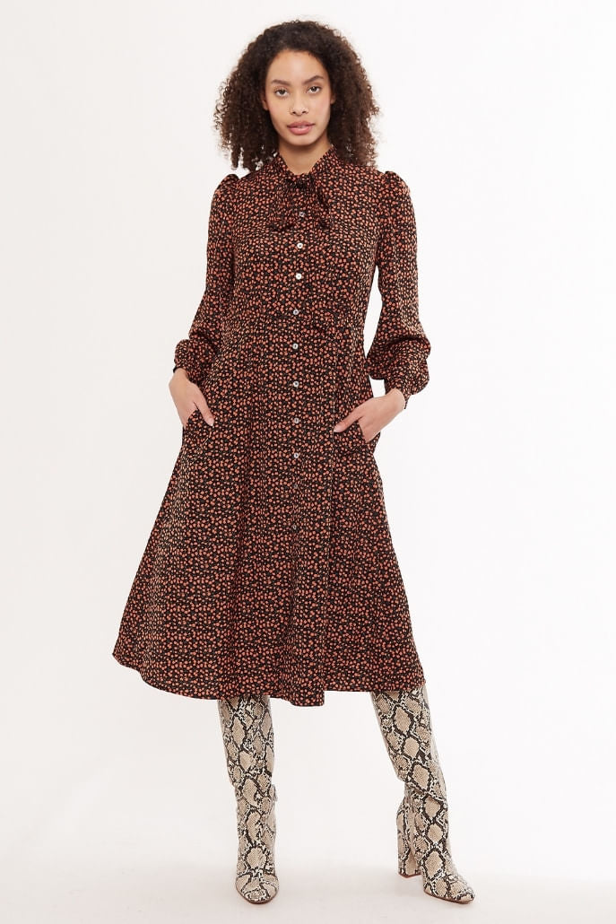 Louche Zuri Piccola Flower Print Tie Neck Long Sleeve Midi Dress