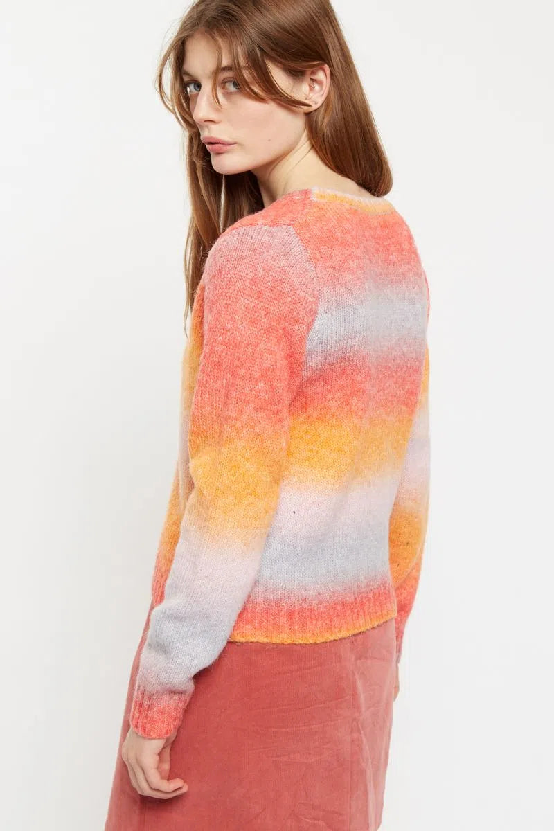 When you need a hug try on Thao, this relaxed fit slightly cropped cardigan is just so warm and cosy. Knitted in a space dyed yarn which gives the appearance of gentle ombre stripes.