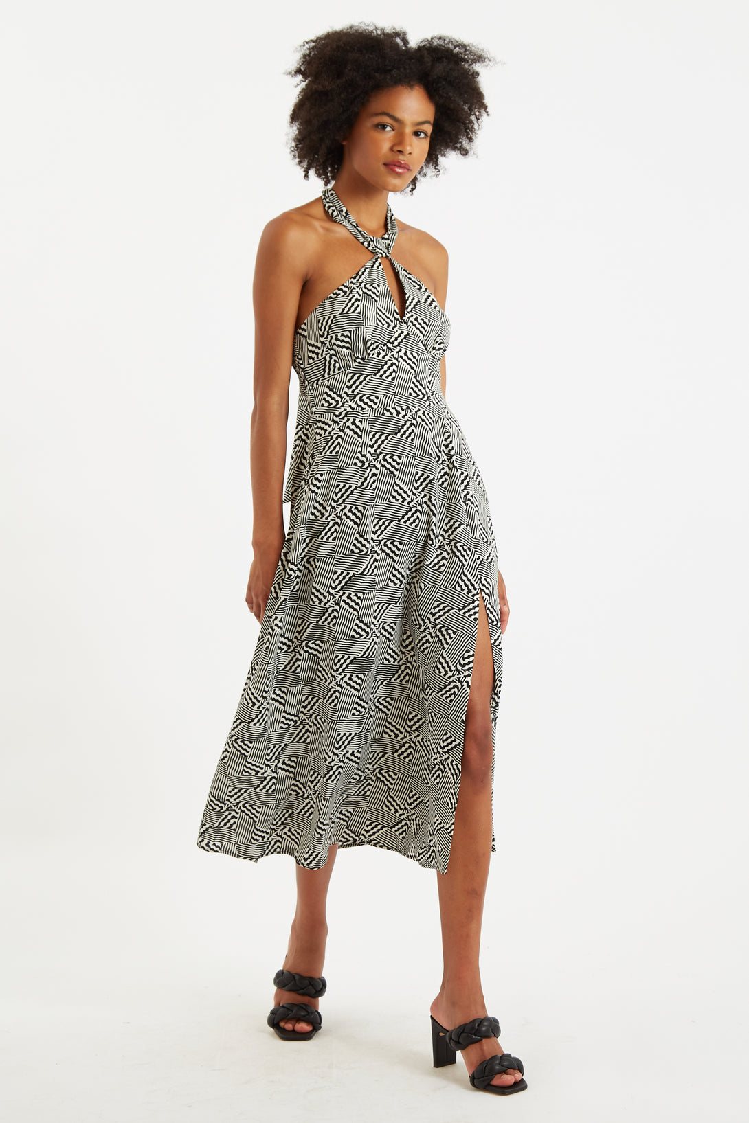 Introducing Geri our dramatic halter tie midi dress which will dazzle in any occasion. Crafted in a premium polyester fabric with a unique 60's inspired graphic print. Features an elasticated back bodice for the perfect fit. A hip skimming skirt with off centre split. Just add some black heels and your ready to go.