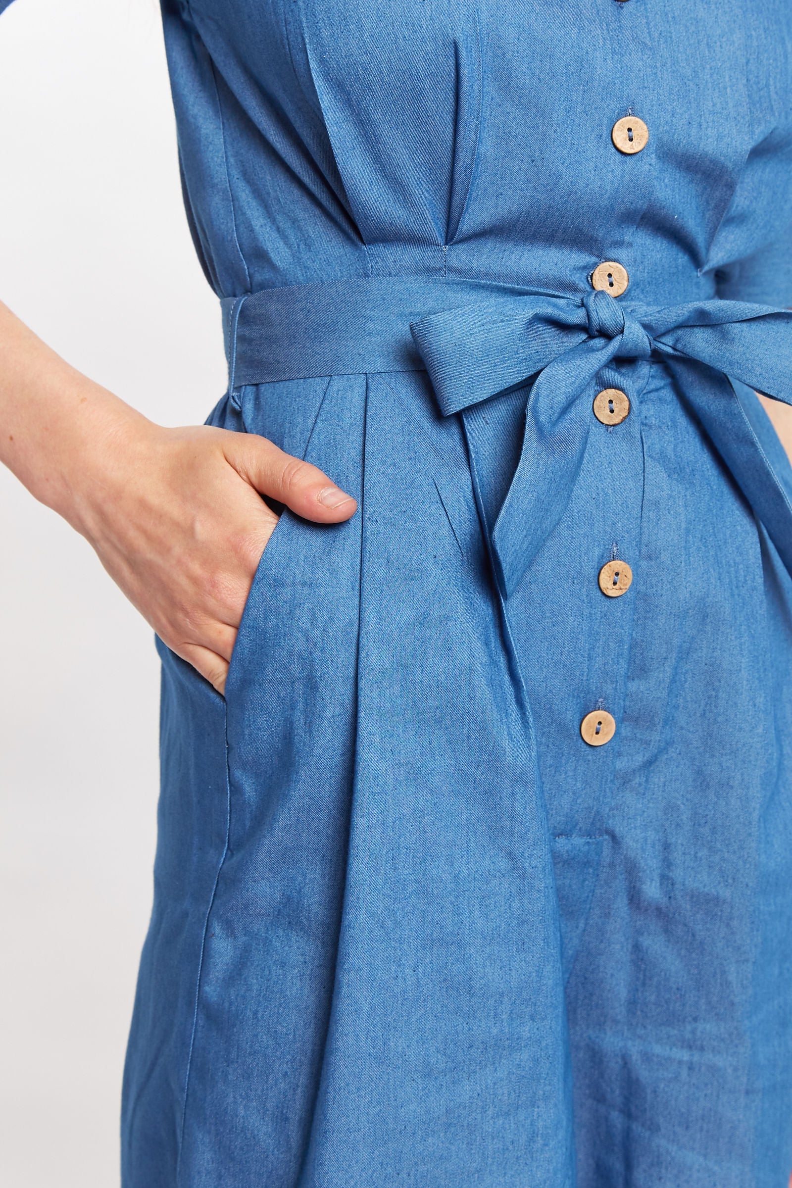 Magda is a new addition and set to be a wardrobe essential. This cropped length, beautifully shaped jumpsuit packs a punch. Boasting a cute Peter pan collar, elasticated waist for definition and comfort, a self tie waist, puff sleeves and gathering in the front and back yokes. Crafted in a durable, cotton blend chambray in navy. A stand alone show stopper that can be worn for any occasion or casually day to day.