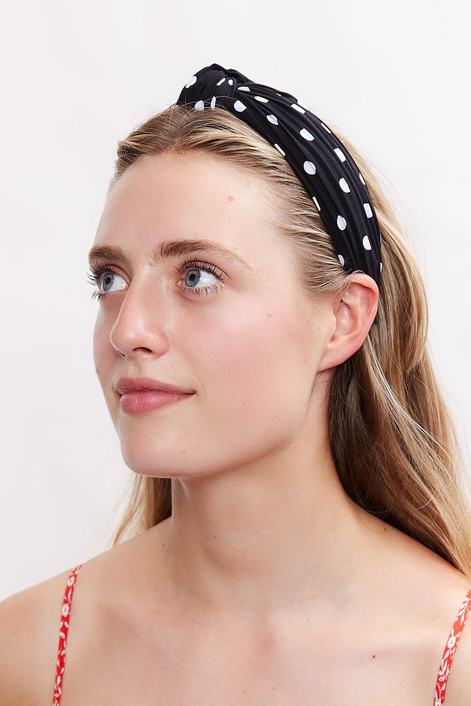 A classic retro polka dot headband made of black and white pleated fabric and featuring a knot at top.