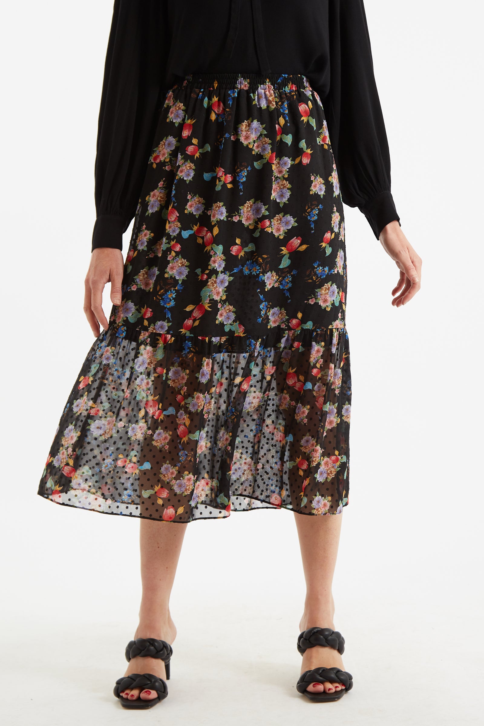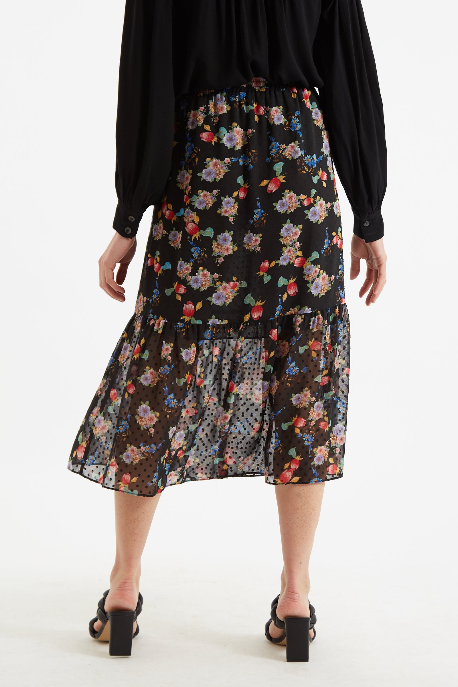 Looking for a skirt to elevate all those black tops on your wardrobe? Take a look at Dasha, this fully lined tiered midi skirt is just that. Crafted in a colourful black based floral print swiss dot. Features an easy fit elasticated waistband.