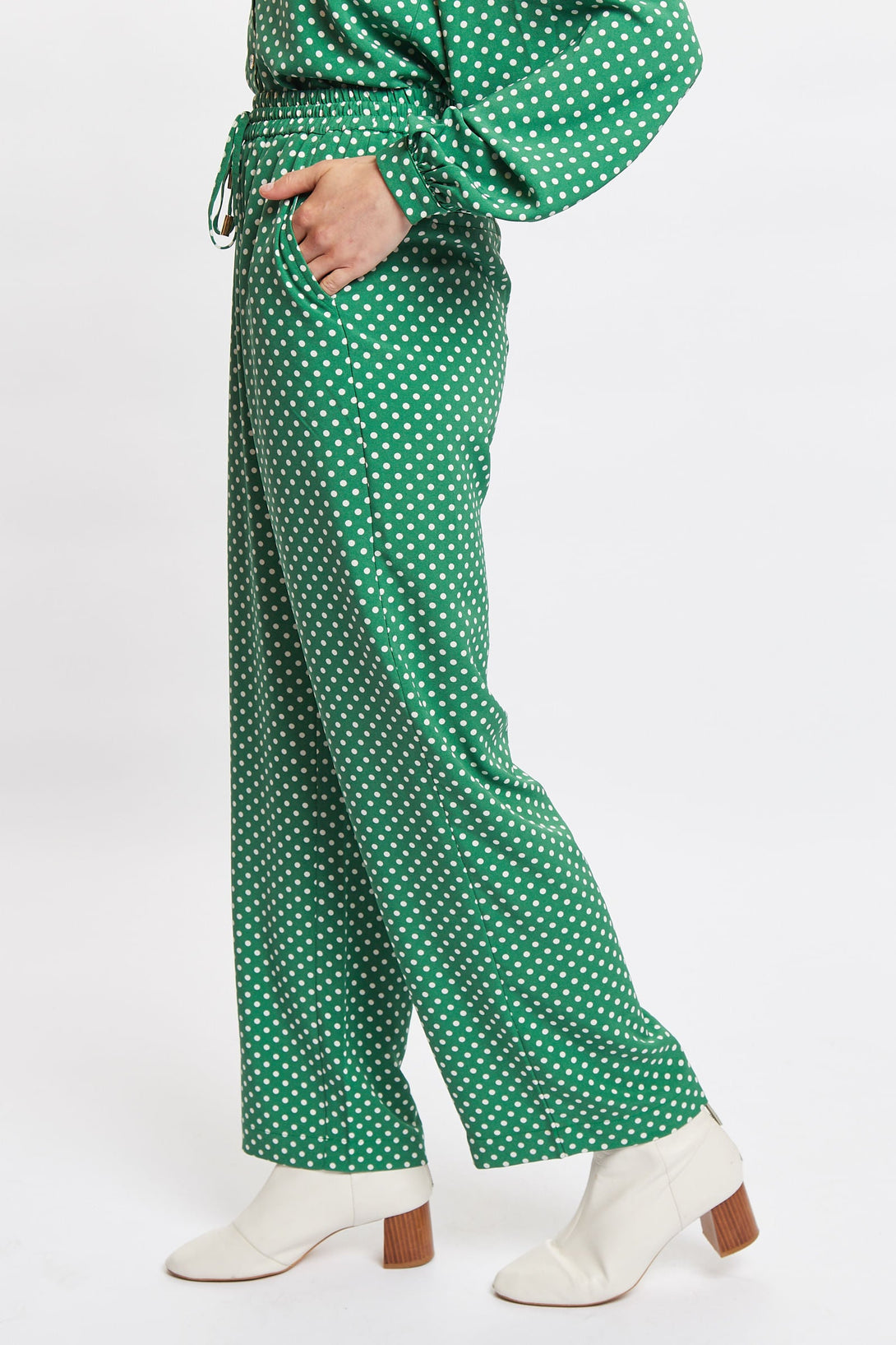 We are totally in love with these comfy yet elegant pyjama style trousers crafted in a luxurious feeling heavyweight polyester. Featuring a comfortable elasticated waist, straight leg fit, and a beautiful rose gold trimmed toggle fastening. Pair with our Lima blouse also in polka dot green for a striking co-ord that will bring some vibrancy to any occasion.