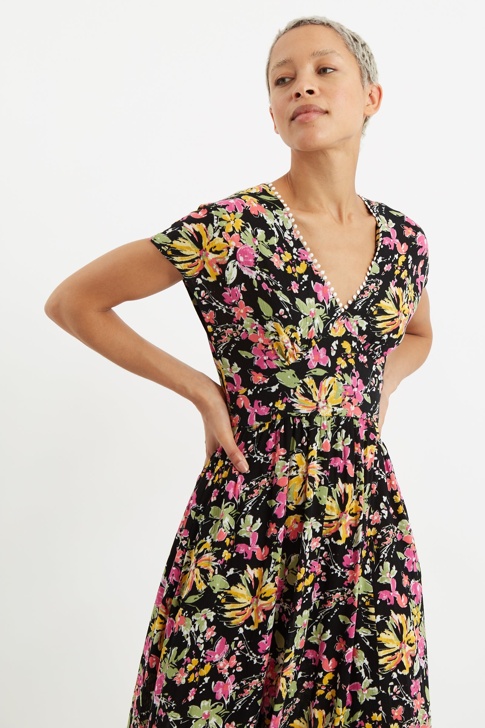 Unity is one of your favourite styles this season we have made it in a wow bright summer floral on a black ground trimmed with  small bobble trim. Featuring a flattering V neckline, an elastic back waist for definition a side front split and side pockets. Unity looks good dressed up or down, making it that go to dress for any occasion.