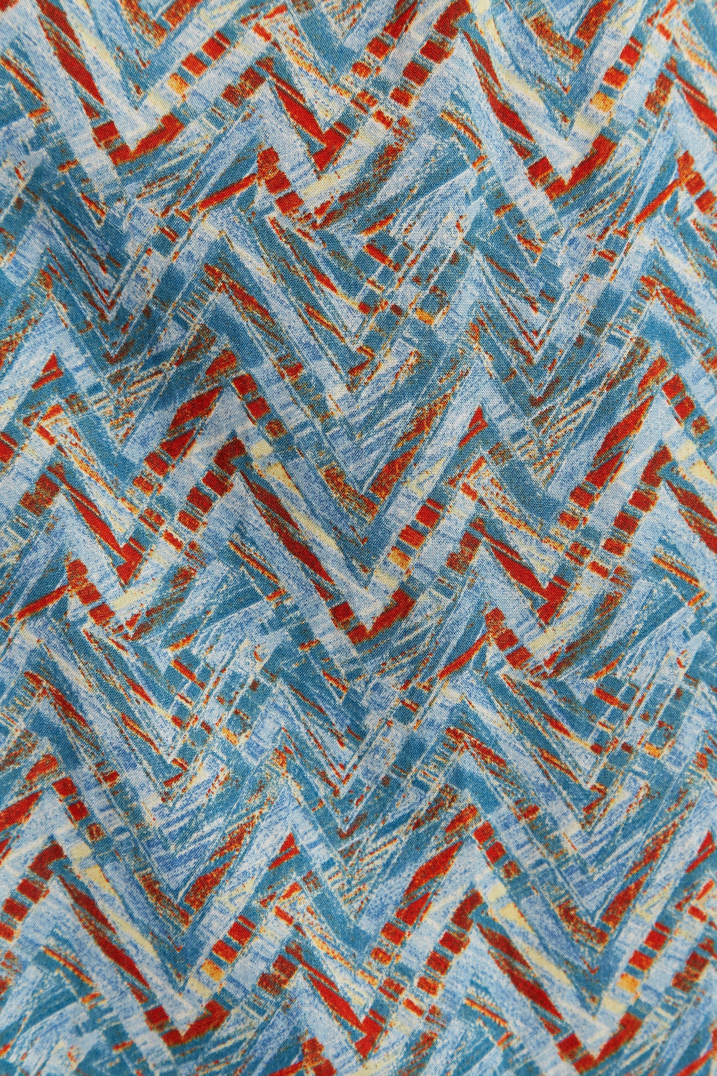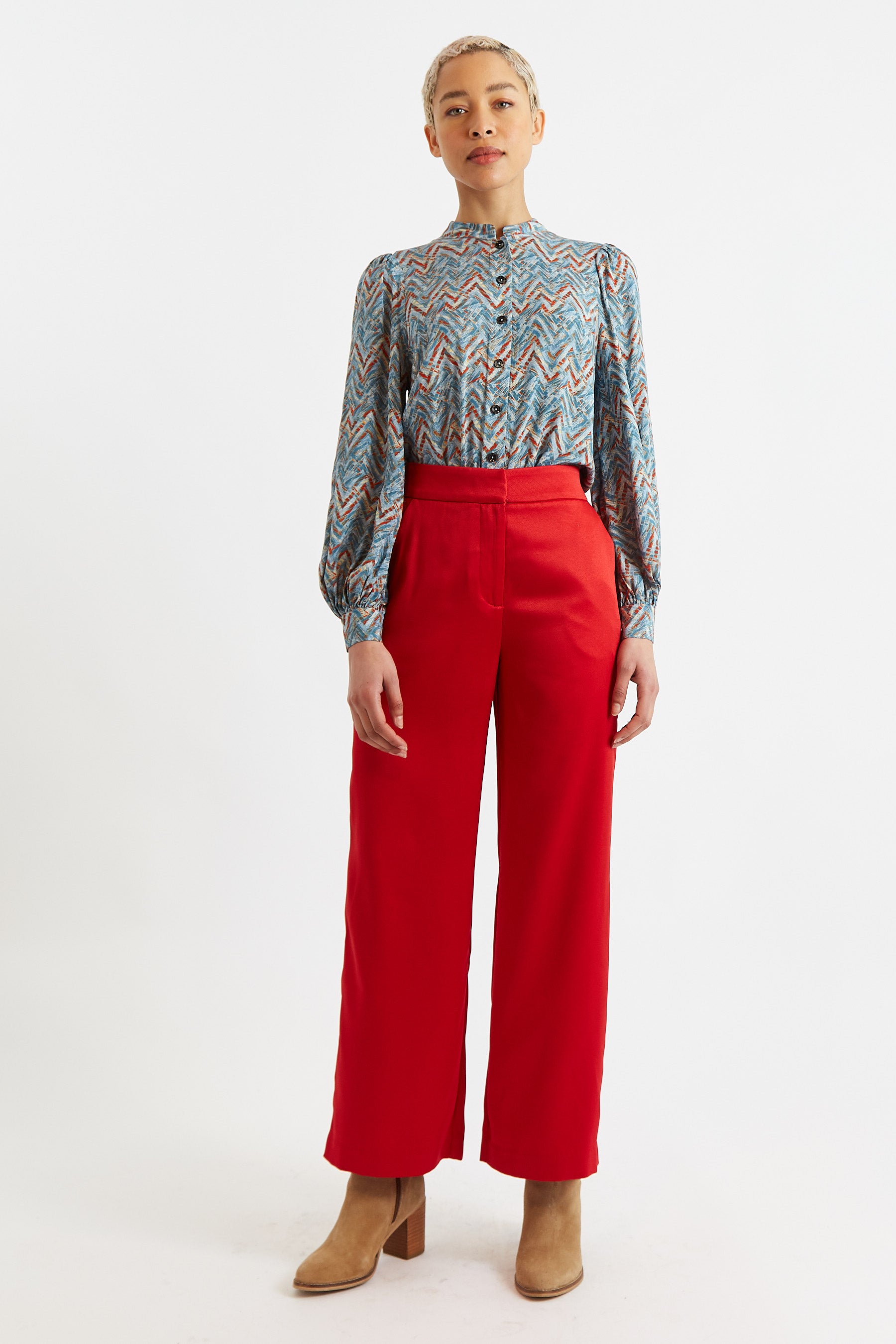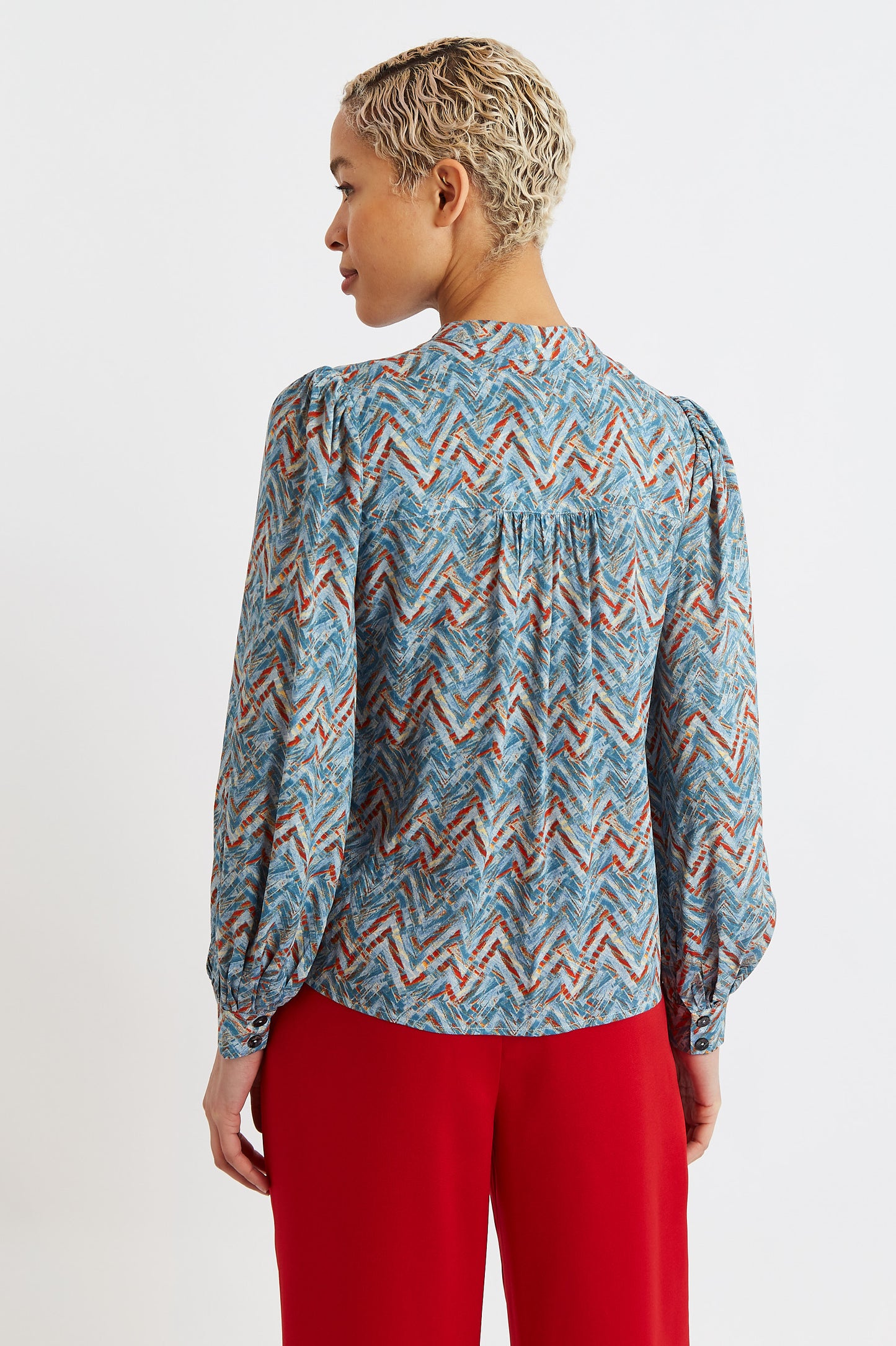 Craft a fashionable ensemble with the Aviv Art Attack print long sleeve blouse. This duck egg-coloured blouse in a geometric chevron design with accents of camel and red. Features an elegant banded neckline and billowing sleeves. Whether paired with trousers or a skirt, this relaxed fit blouse adds a unique artful touch to any look.
