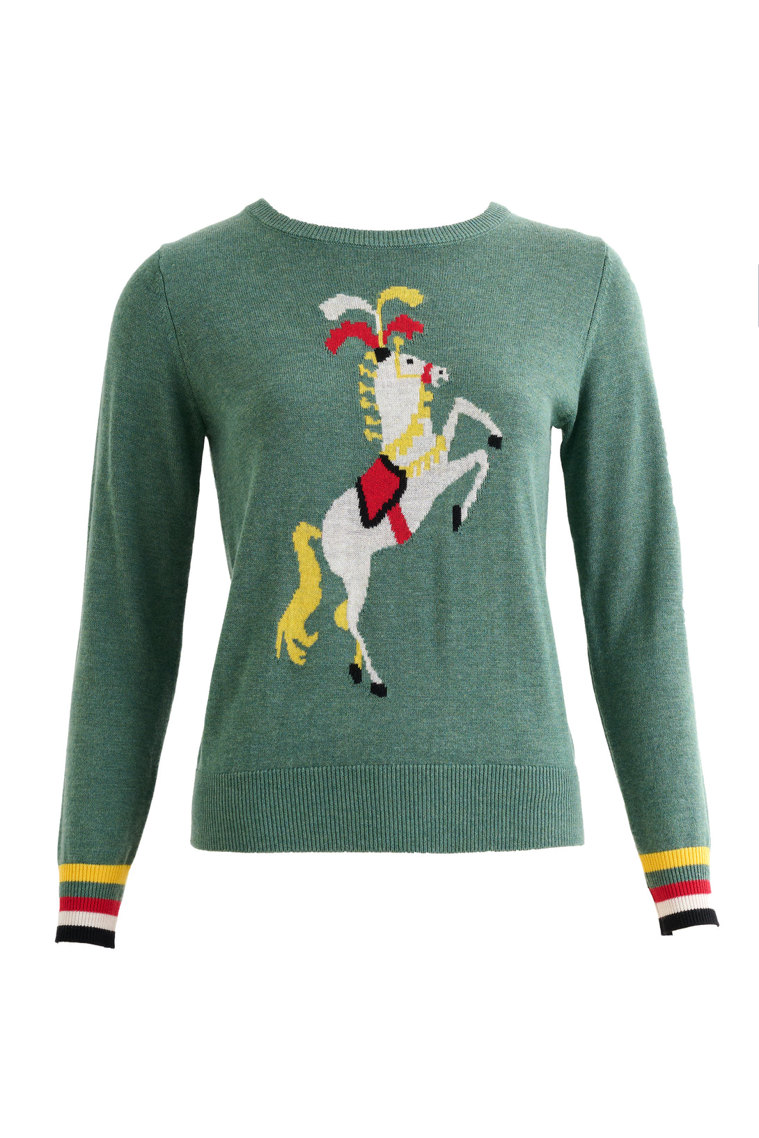 Bring a splash of fun to your wardrobe with this lively sage green jumper featuring a brightly coloured intarsia circus pony. Perfect for pairing with our Aubin red winter check mini or your favourite denims.