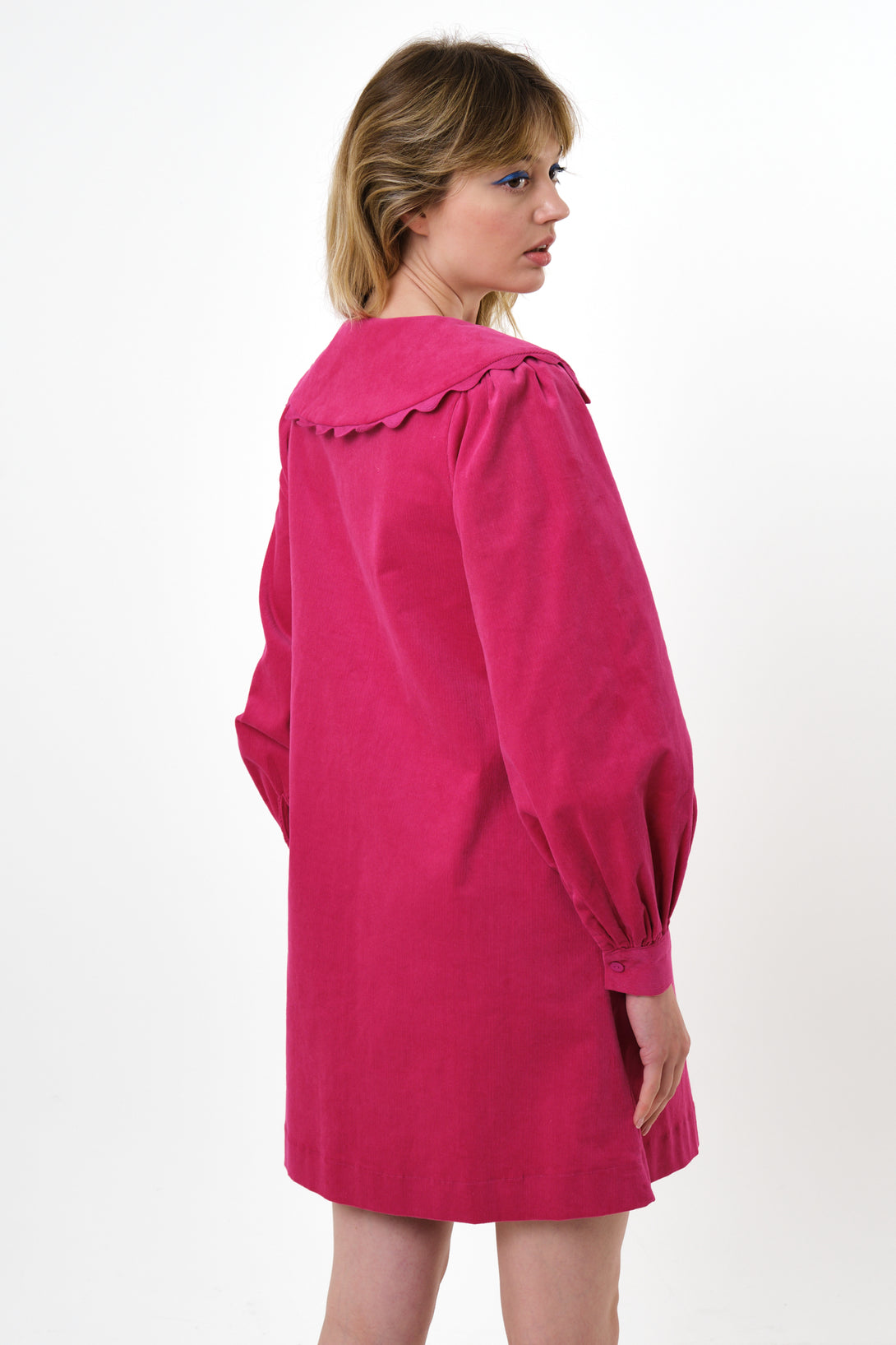This transitional dopamine pink baby cord mini dress will take you through the winter festivities and beyond. Bonny an easy-to-wear A-line baby cord dress features a statement collar trimmed with giant ricrac and those essential side seam pockets.