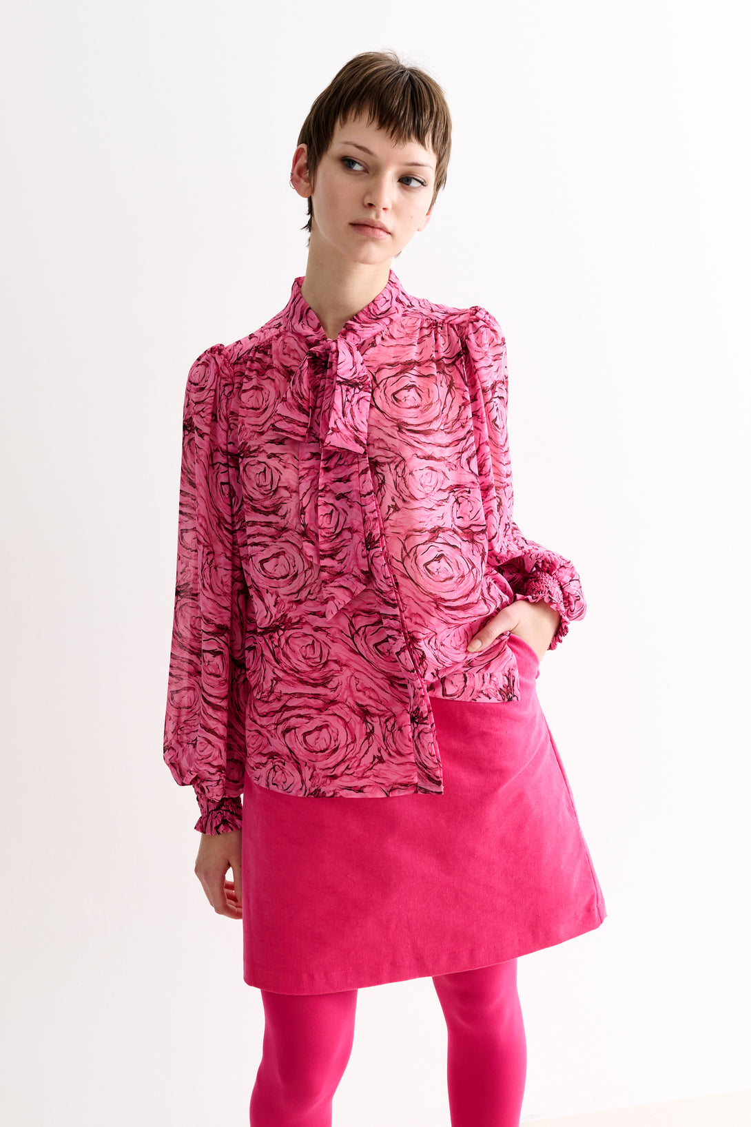 The Boo Rosechild tie neck blouse in soft pink, subtle sketchy rose print. Features voluminous sleeves and on-trend tie neckline, crafted in a premium soft-handle georgette for a lightweight, elegant drape. Easily blending classic femininity with contemporary style for a polished, versatile wardrobe essential.