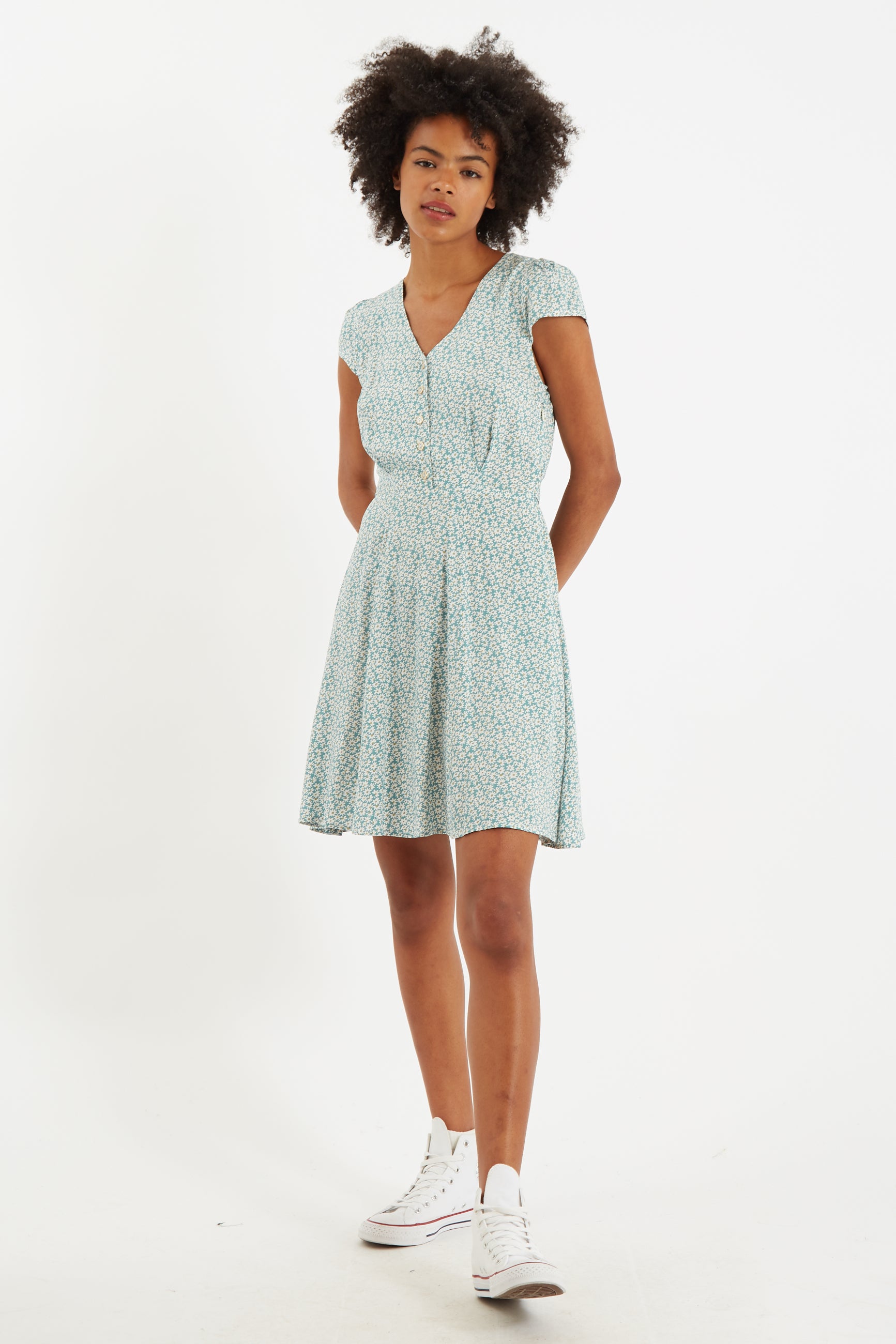 Inspired by a vintage tea dress, our favourite Cathleen dress will serve you well for seasons to come. Crafted in ditsy floral print, this style is simply the most flattering shape ever. Featuring cap sleeves, a fitted bodice with gold edged buttons, back tie waist to customise your fit and of course those deep side seam pockets we all truly love. Style with your ankle boots or trainers and let her be your forever dress.