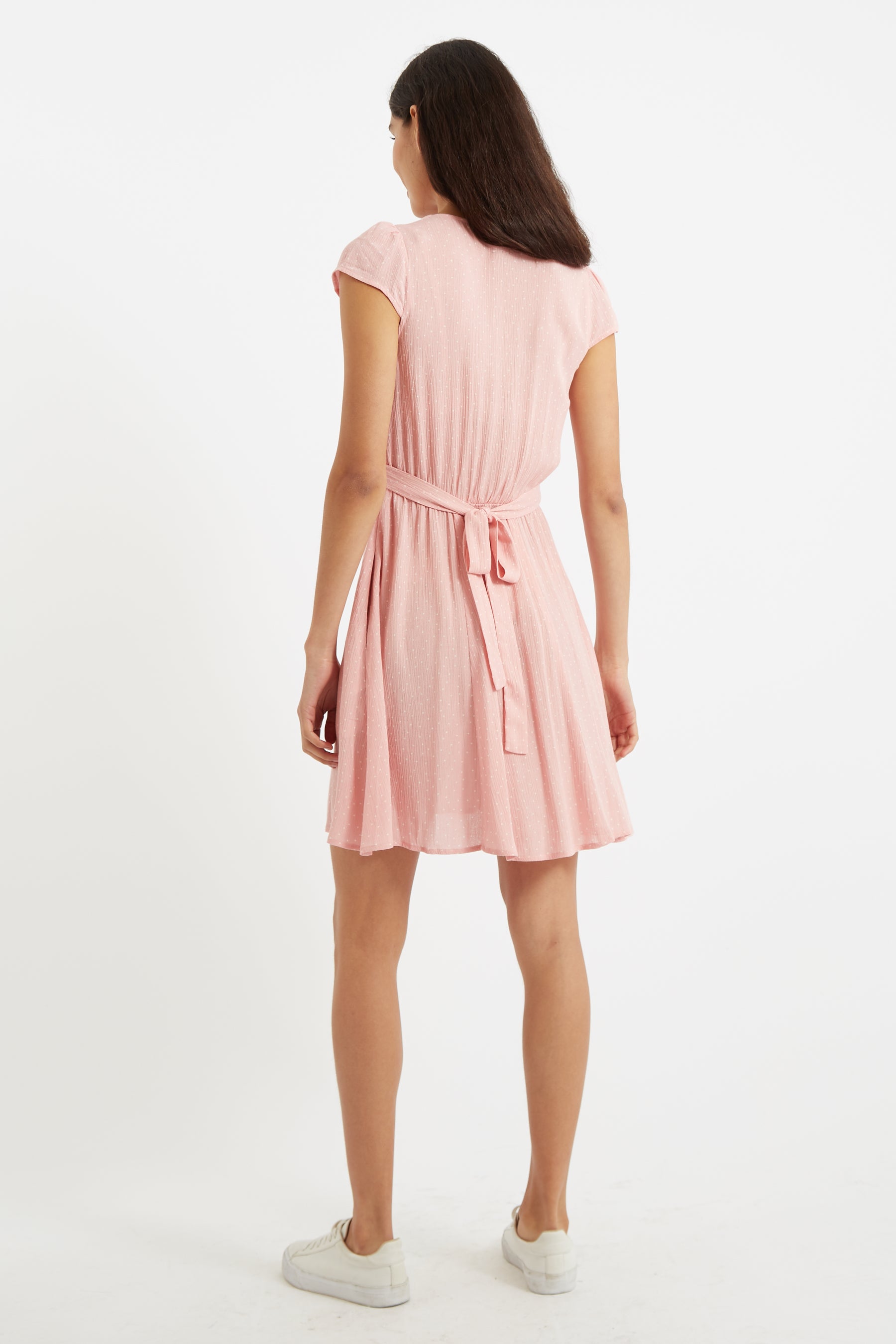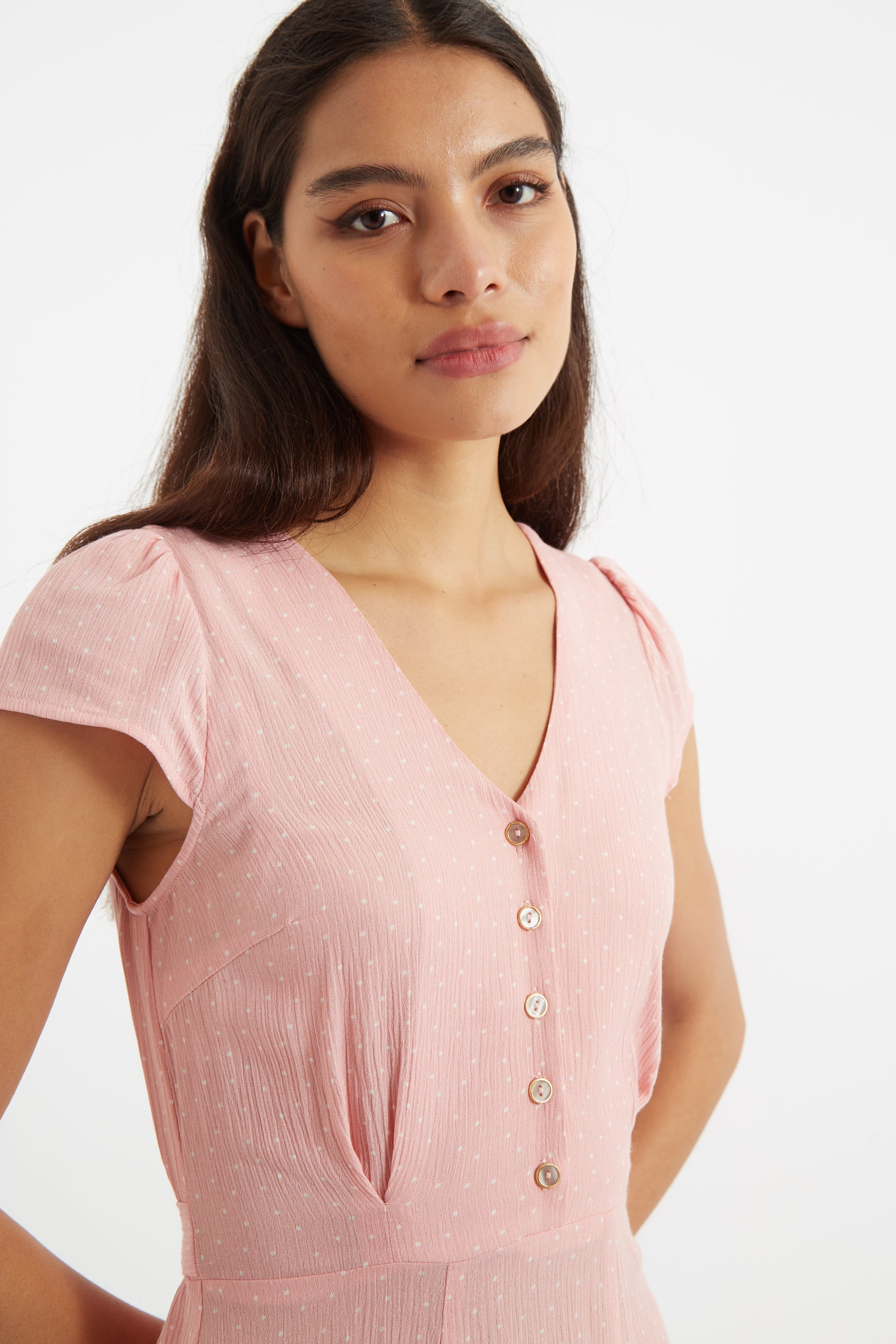 Inspired by a vintage tea dress our favourite Cathleen dress will serve you well for seasons to come. This shape is simply the most flattering shape ever. Crafted in a pale pink crepe printed with tiniest dot. Featuring cap sleeves, a fitted bodice with gold-edged buttons, a back tie waist to customise your fit and of course those deep side seam pockets which we all truly love. Style with sandals or trainers and let her be your forever dress.