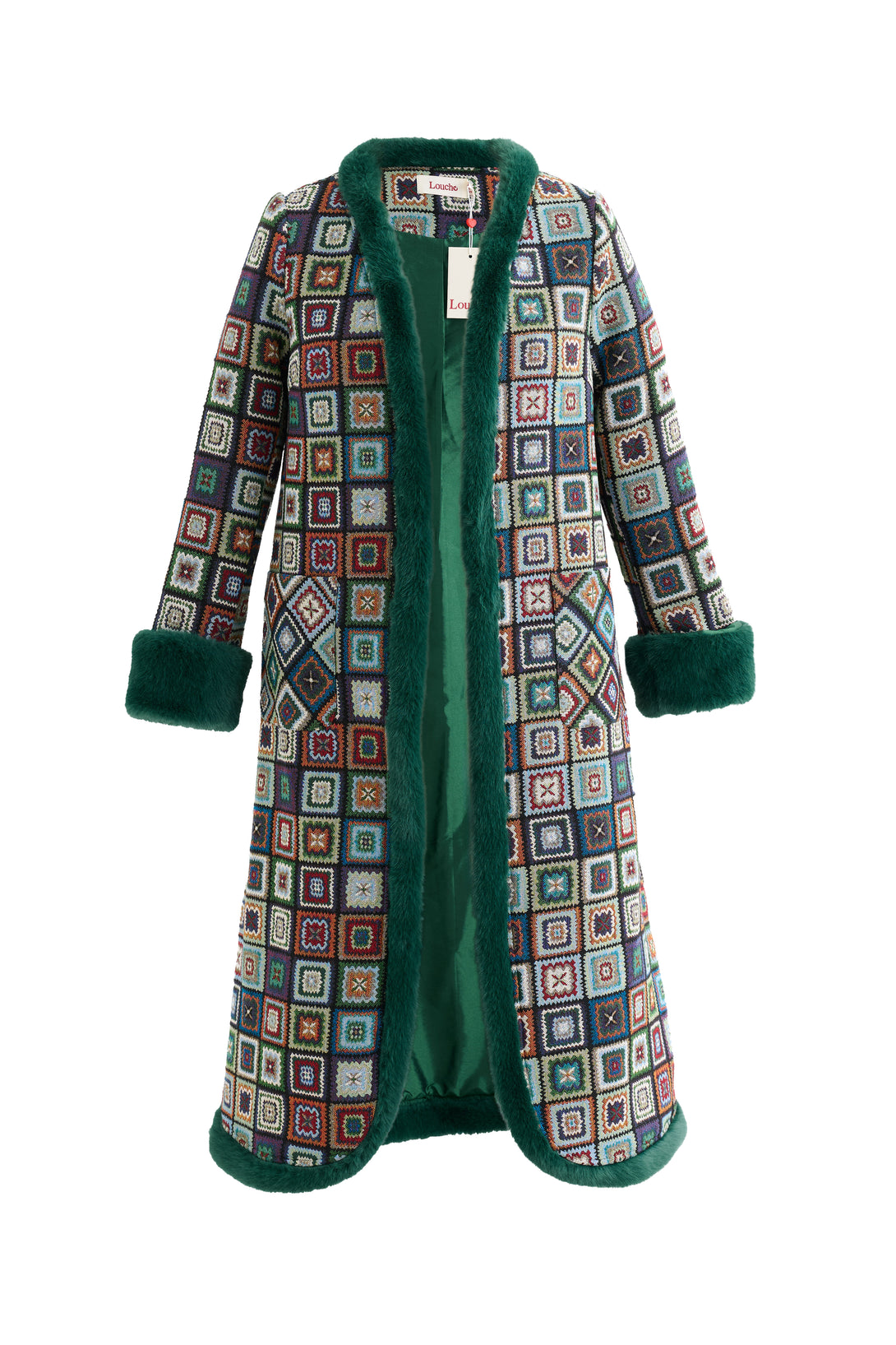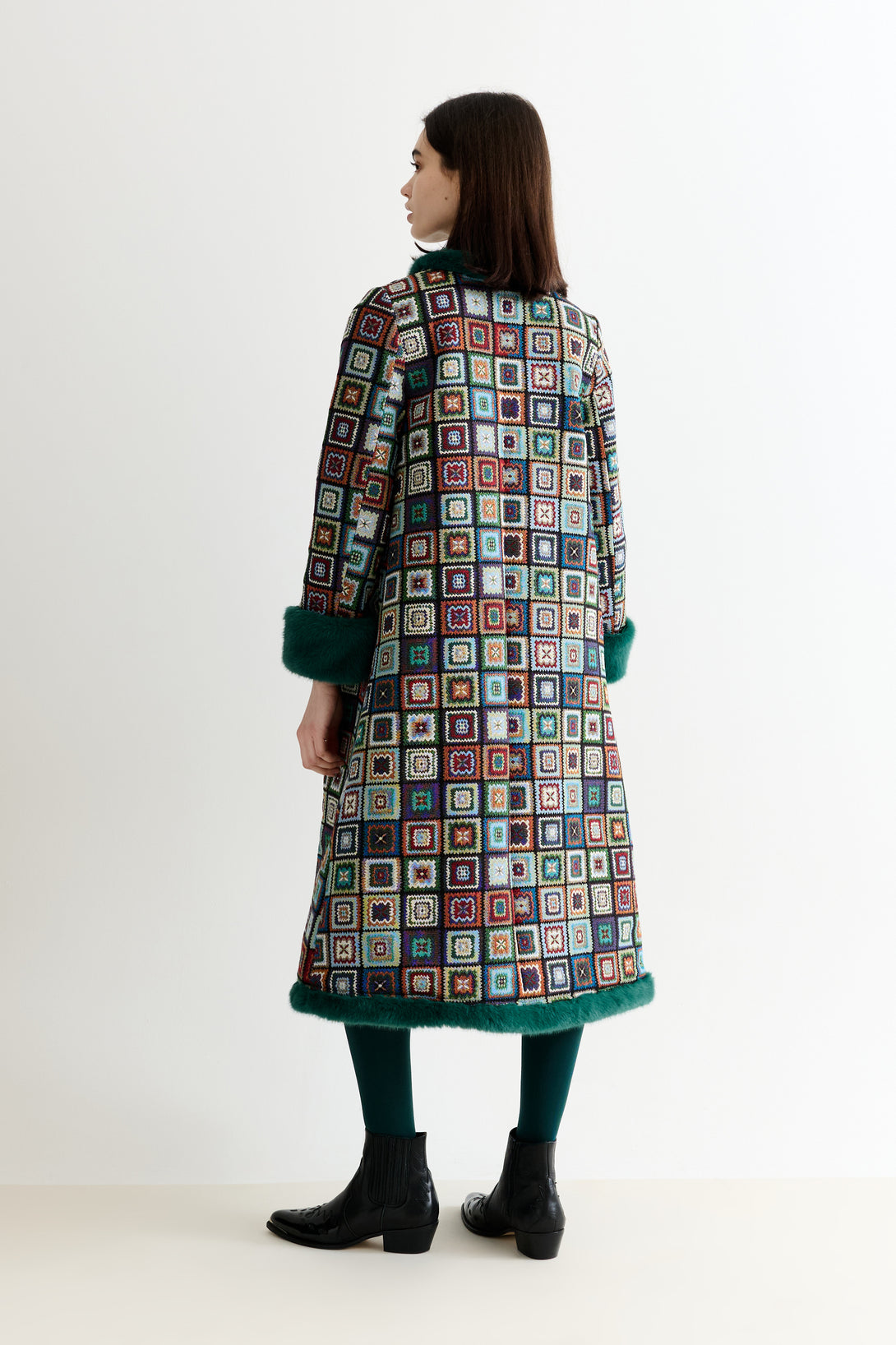 Introducing the Delphia 70's Patch Jacquard fur trim coat. This statement piece features a unique woven crochet patchwork design jacquard and is finished with teal fur trim around the neck, hem, and cuffs, adding style and retro flair to your look.