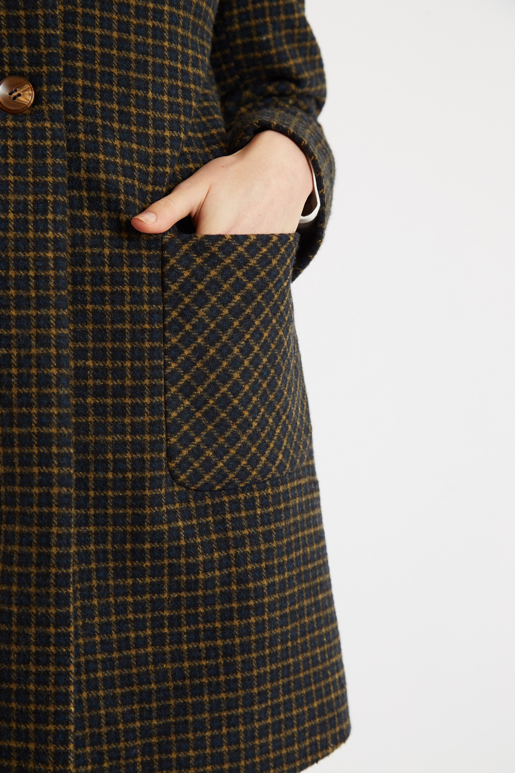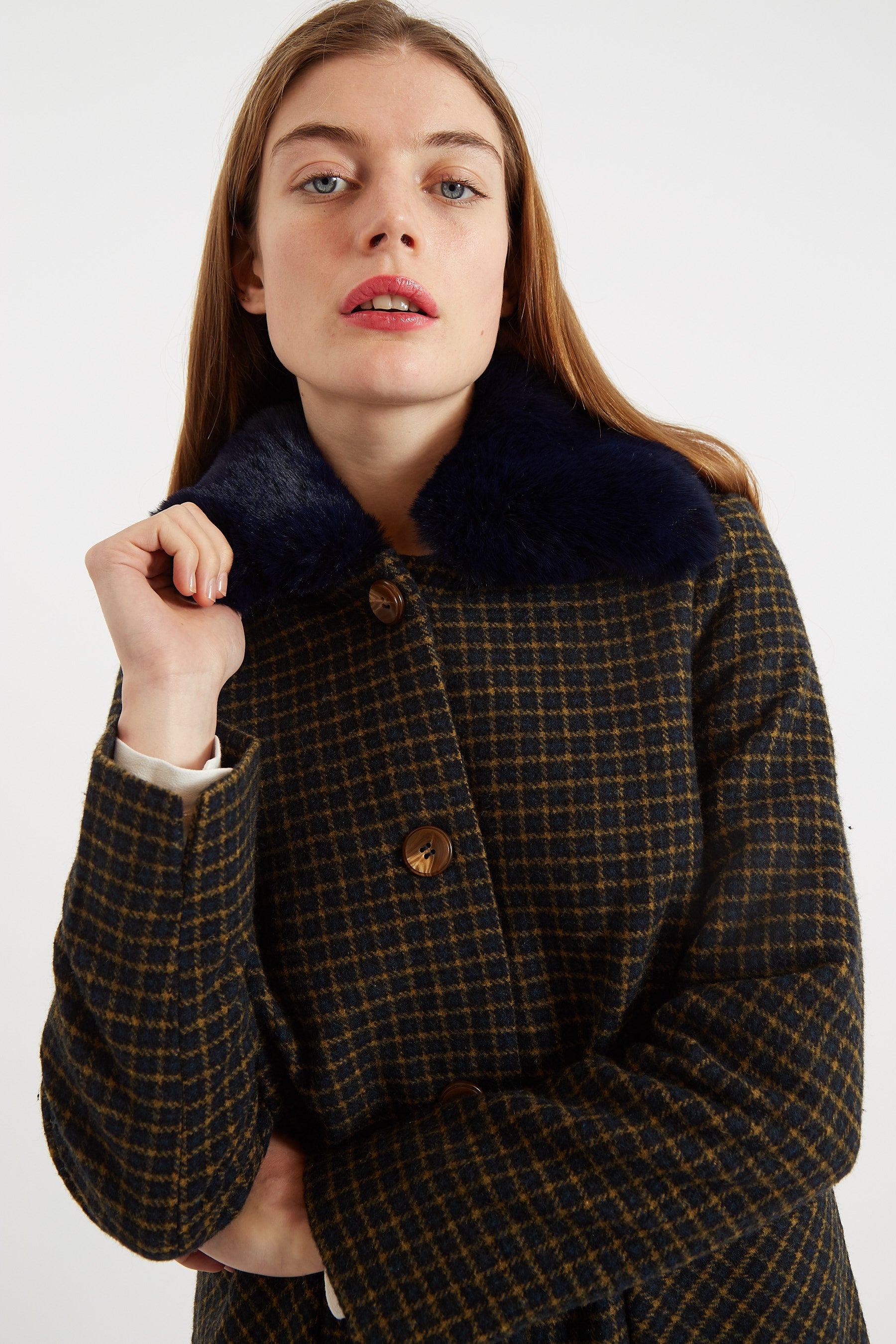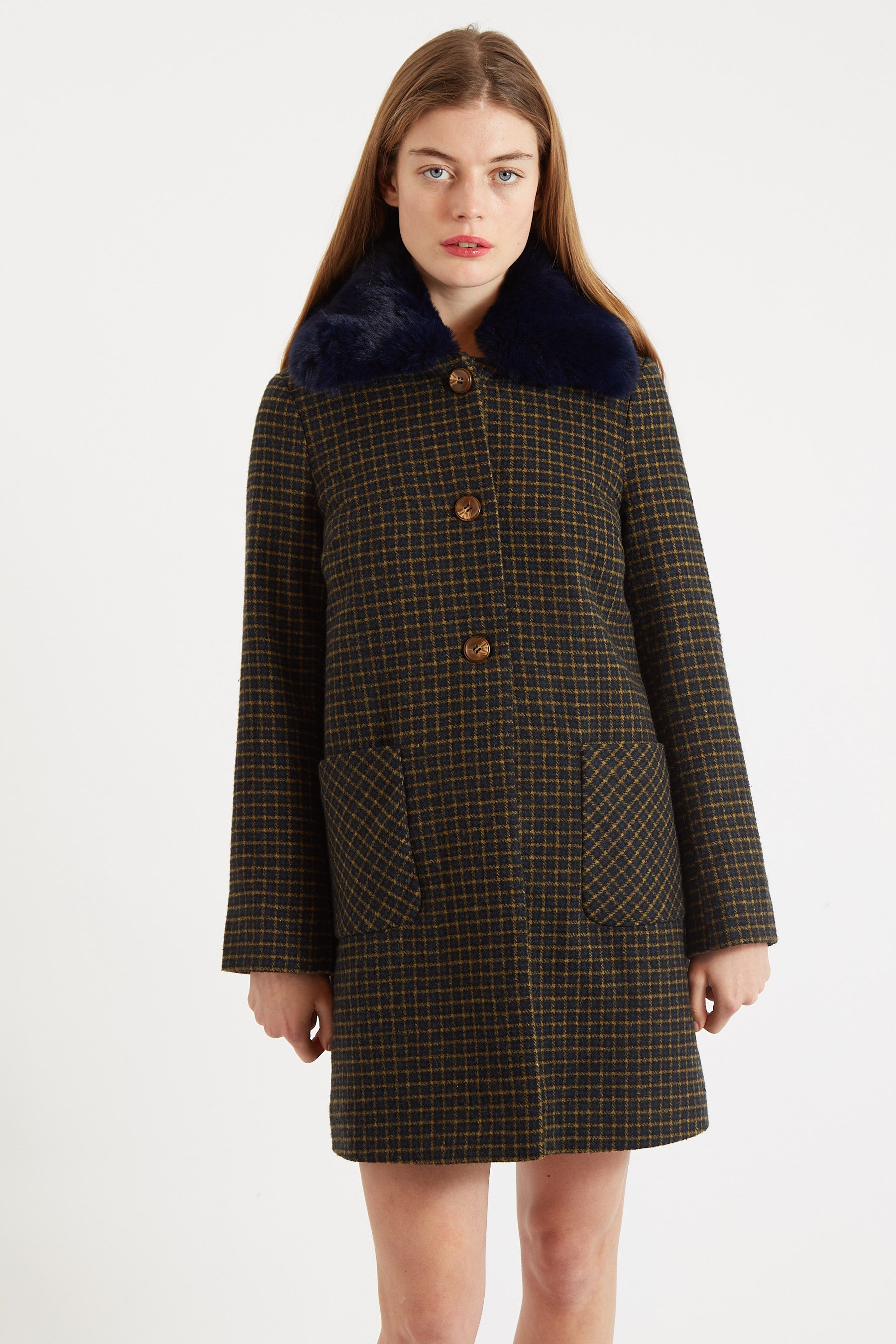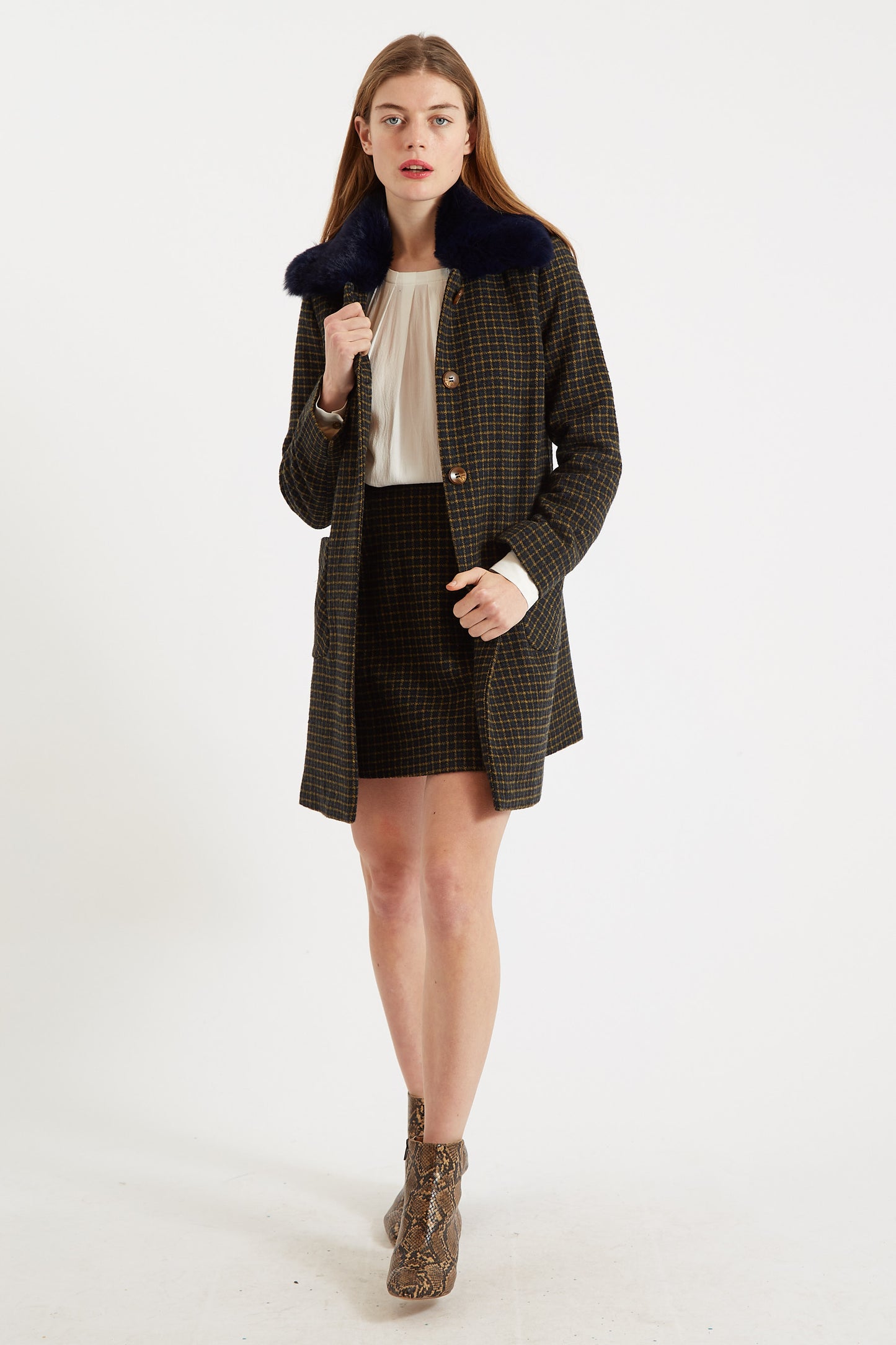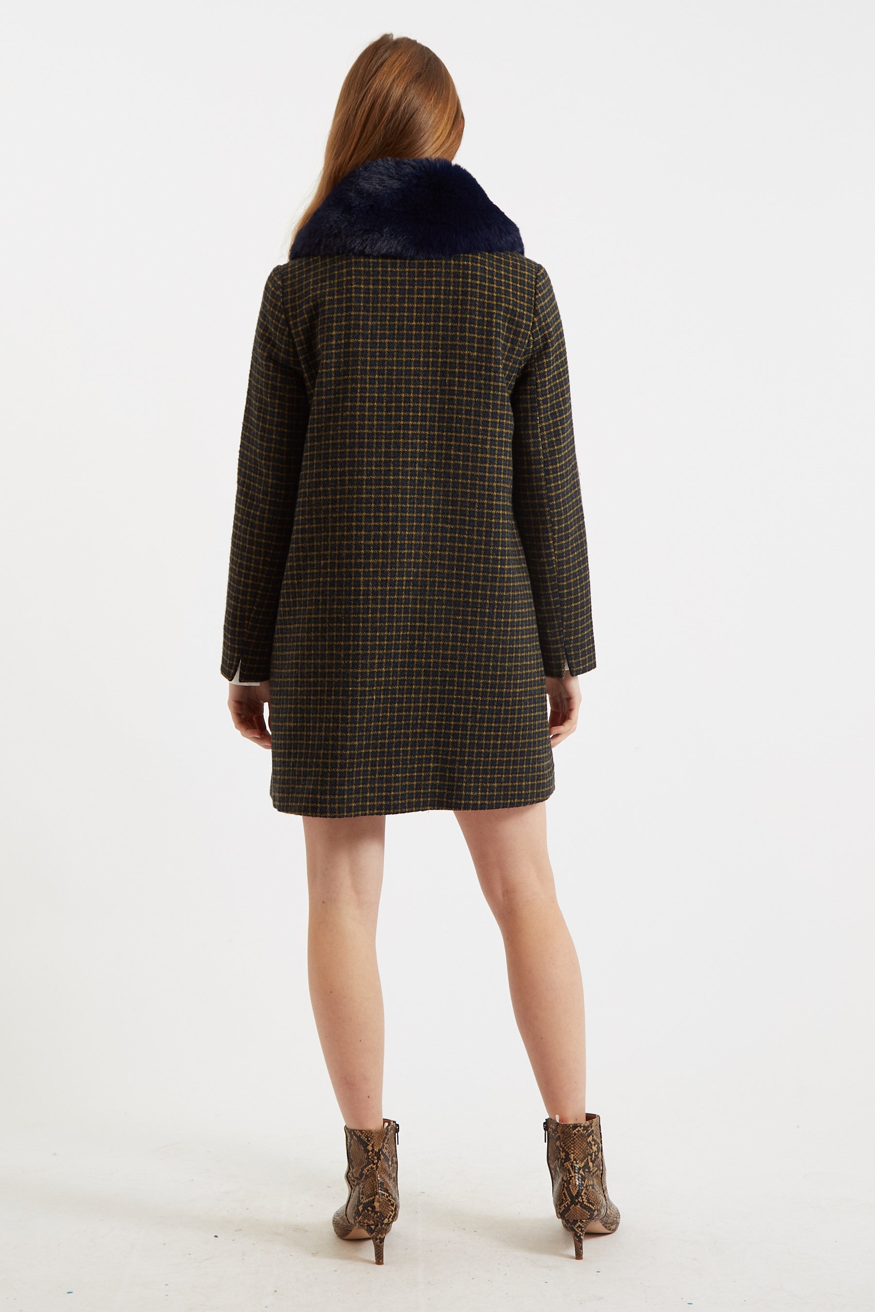Elevate your winter wardrobe with the Dryden Warwick check coat. Crafted from a wool-rich navy and mustard mini check with a luxe navy faux fur collar and lined with a premium shot acetate lining. With two large patch pockets, this A-line coat provides the necessary warmth and style to brave the coldest of days.