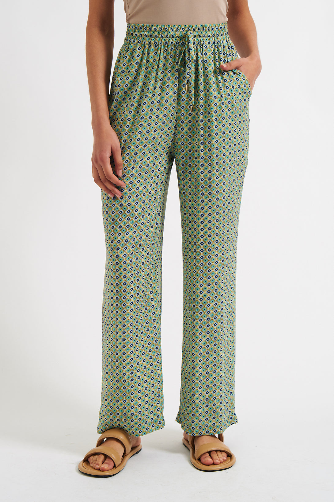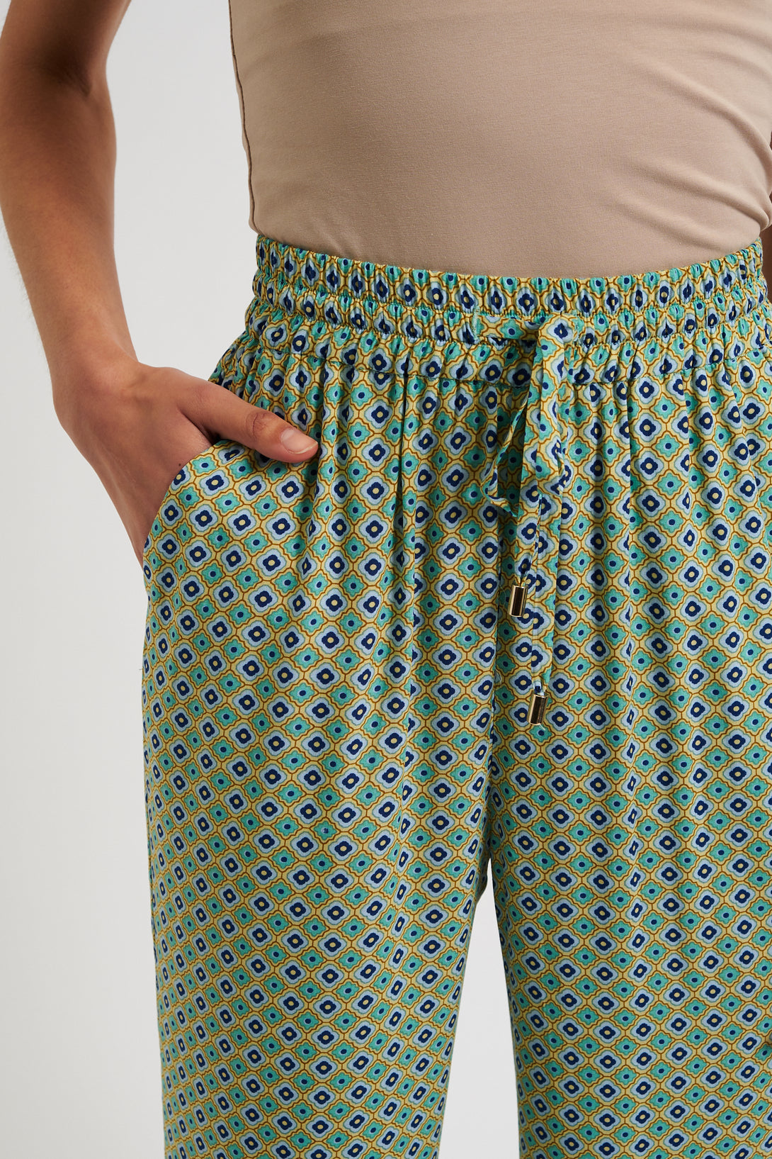 Elevate your style with our Emmanuella Tangiers print PJ-style trousers. Crafted from a soft viscose fabric, these relaxed trousers feature a mini geometric print inspired by the vibrant tiles of Tangiers. Perfect for lounging or partying!