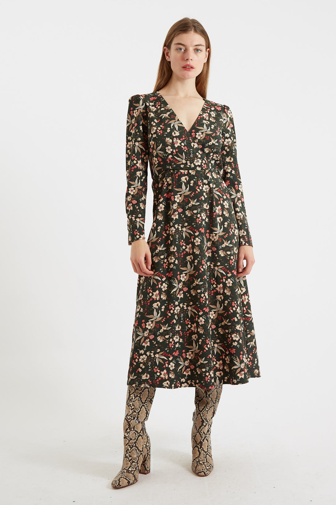 This long-sleeved midi dress is both sophisticated and chic. It features a wrap front bodice with an elasticated back waist providing ease and comfort. Together with deep side seam pockets and a stylish flared skirt it's the perfect dress for any occasion.