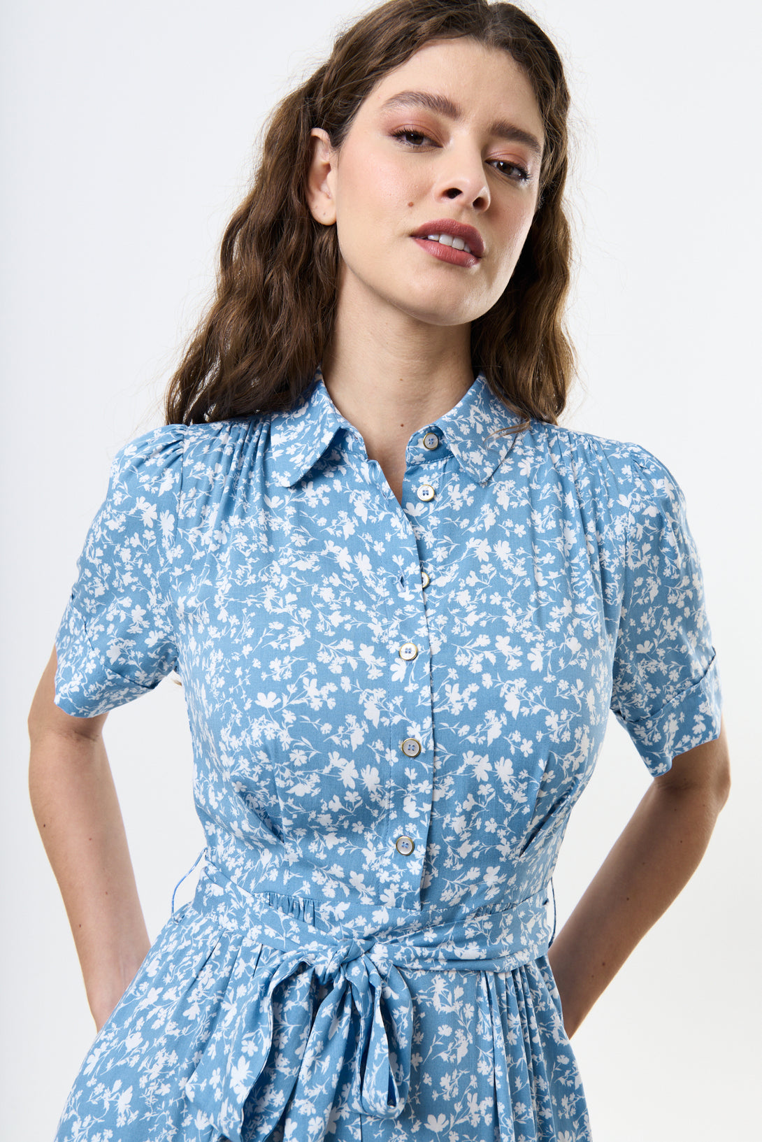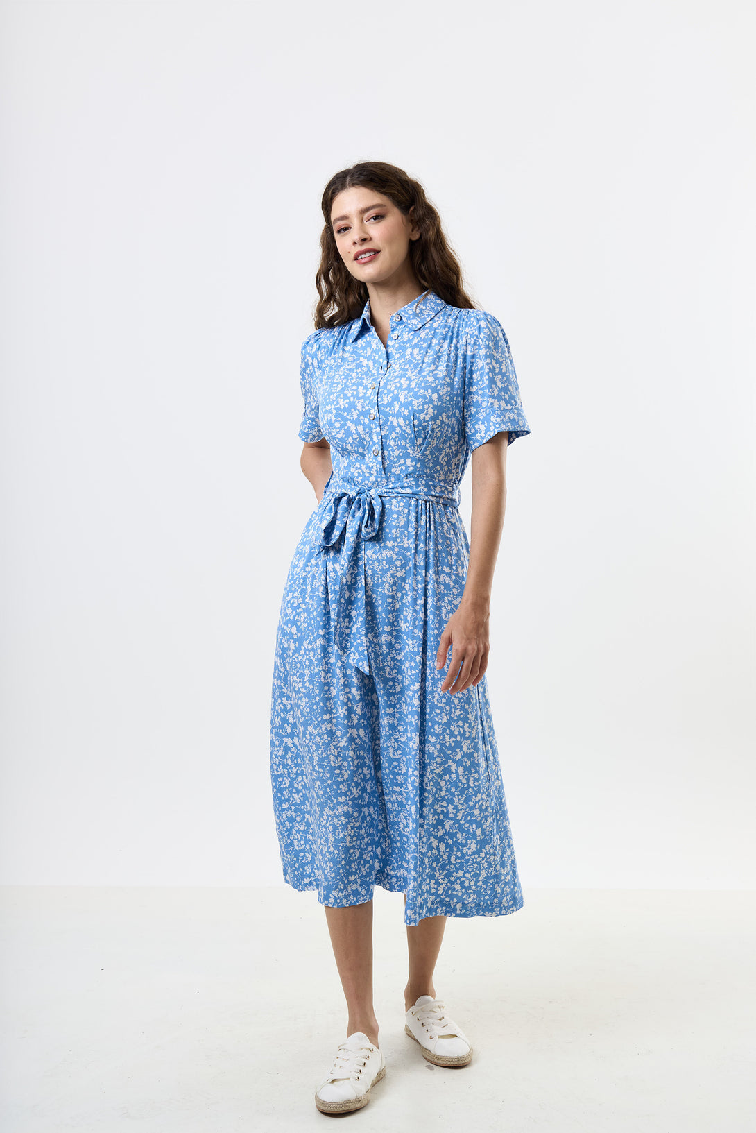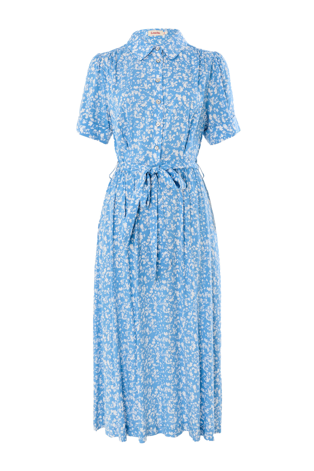 Introducing our Inesa negative floral print short sleeve midi shirtdress in a fresh blue and white ditsy floral. Perfect for any occasion, this versatile dress is a must-have addition to your wardrobe.Your, don't think twice dress for warmer days.