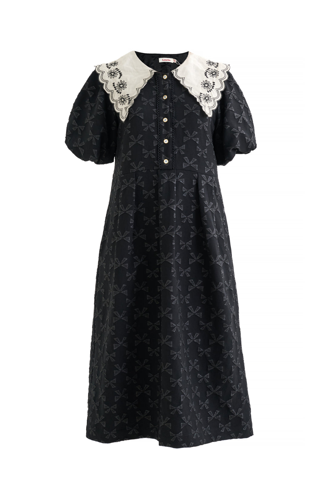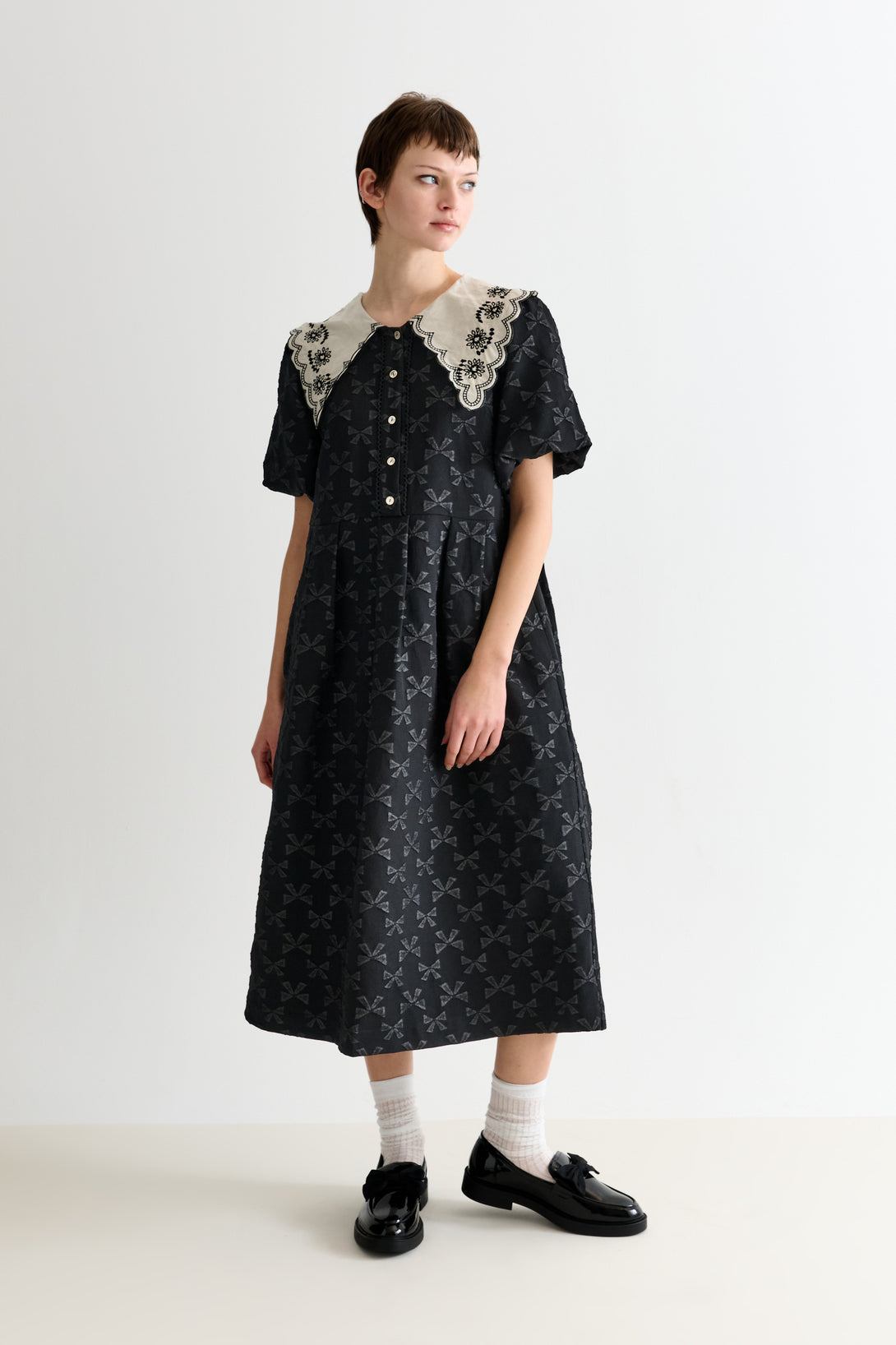 Iris Bow Black Jacquard White Embroidered Collar Midi Dress
