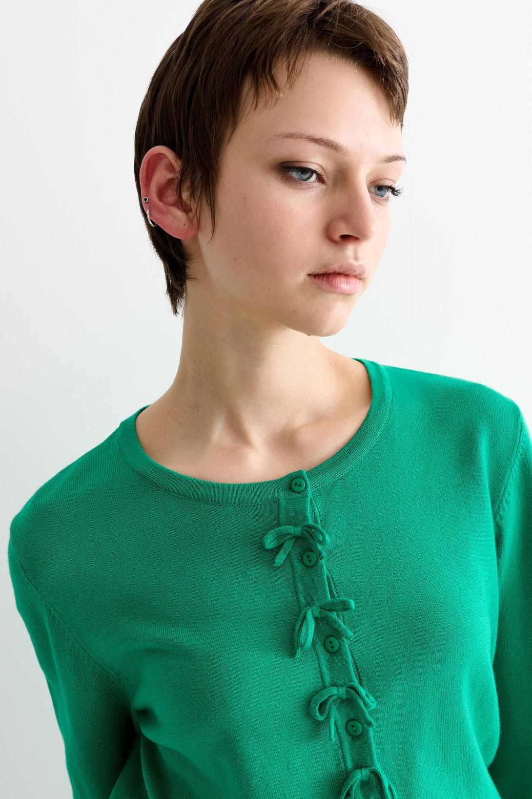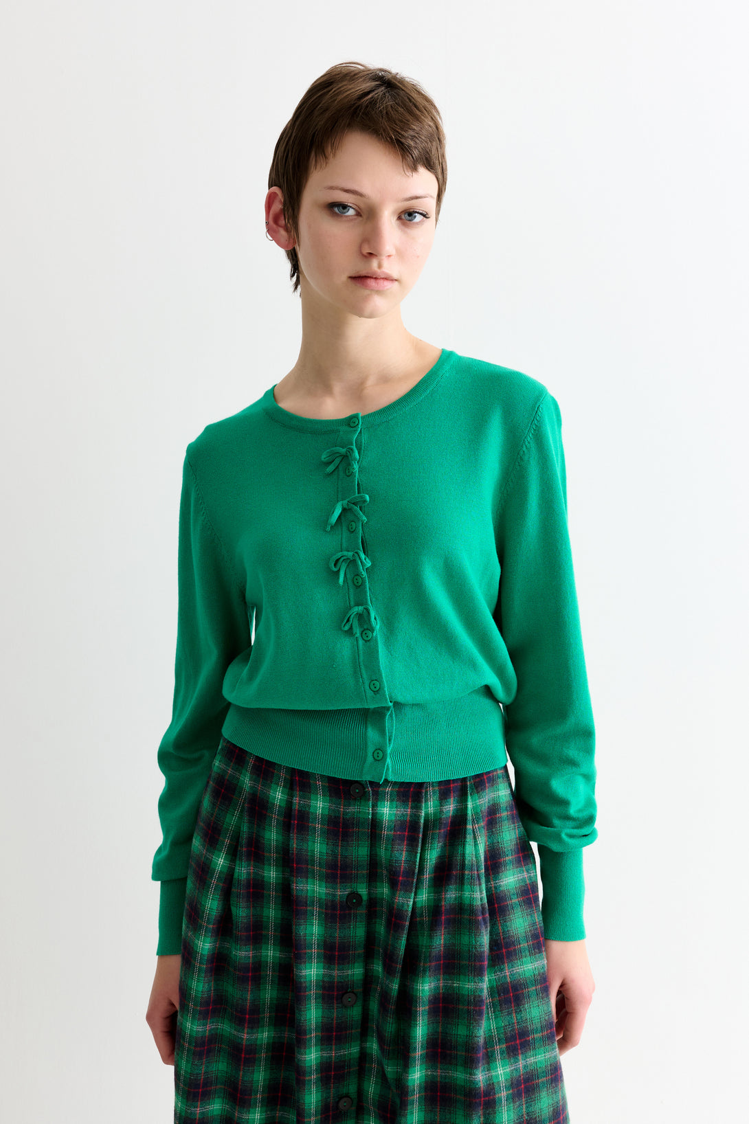 This playful green cardigan, detailed with charming bow trims, is every girl’s go-to for stylish layering. Its versatile design makes it perfect for any season, combining comfort and cuteness in one must-have wardrobe piece.