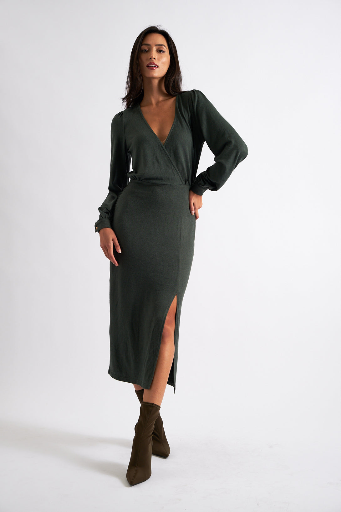 Introducing the Karen brushed marl jersey midi dress in forest green! Made with soft and cosy brushed marl jersey, this dress features a flattering wrap bodice, elastic back waist, billowing sleeves, and an off-centre split for added style. Versatile and on-trend, it's a must-have addition to your wardrobe!