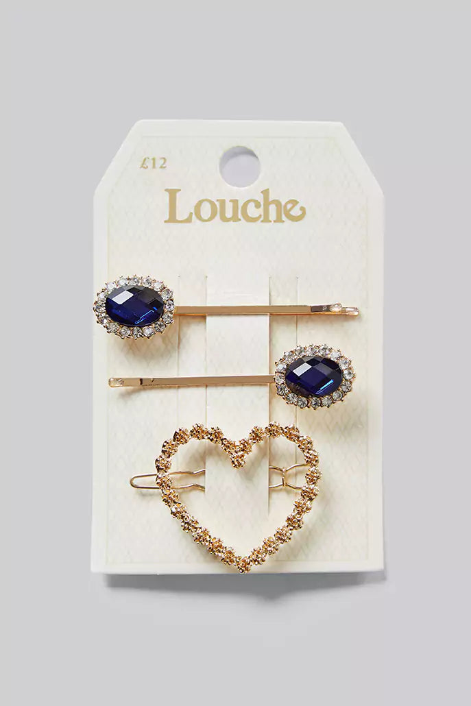 "Add some sparkle and whimsy to your hair with the Kat set of 3 hair clips. This set includes a heart-shaped clip with crystal accents and two clips featuring dazzling deep blue sapphire coloured stones. Perfect for adding a touch of glamour to any hairstyle!"