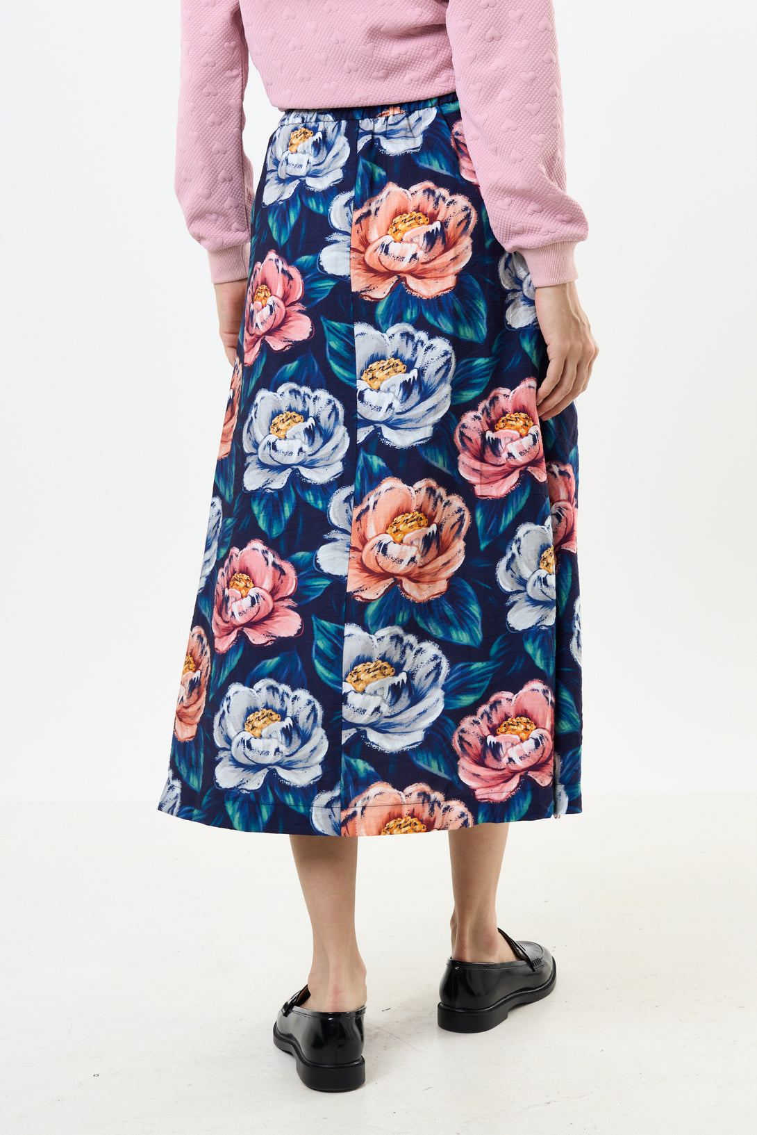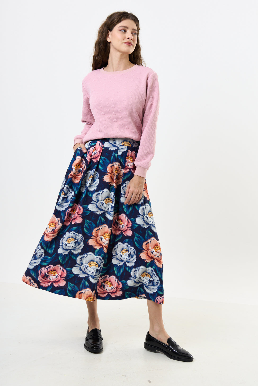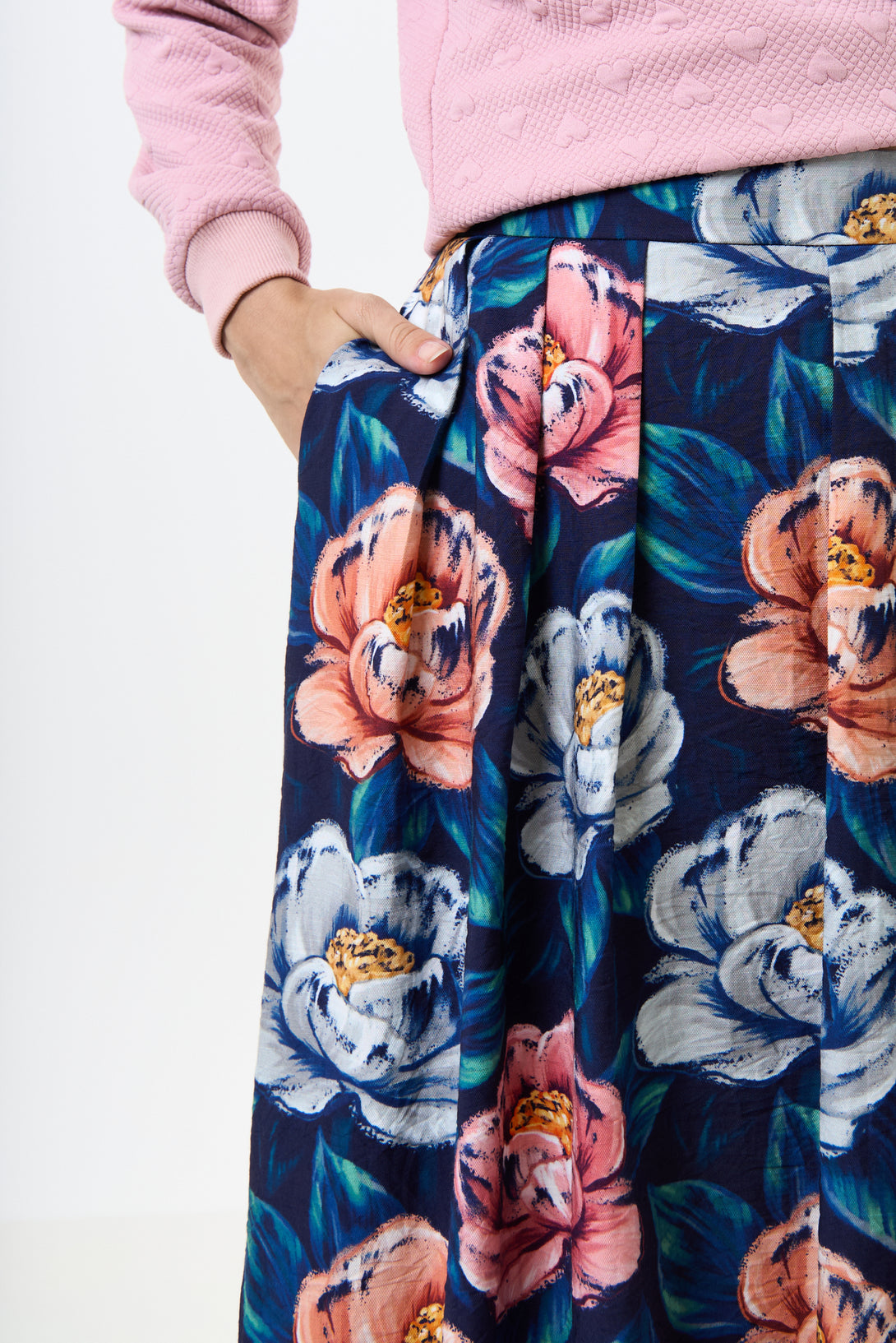 Your favourite Lizea midi skirt crafted now in a chalky peony print. This sweeping pleated design skirt is sure to stand out in your wardrobe. This skirt is easy to pair with almost anything in your wardrobe because of its navy base and multicolour print. Be it an off-white blouse or one of our colourful jumpers
