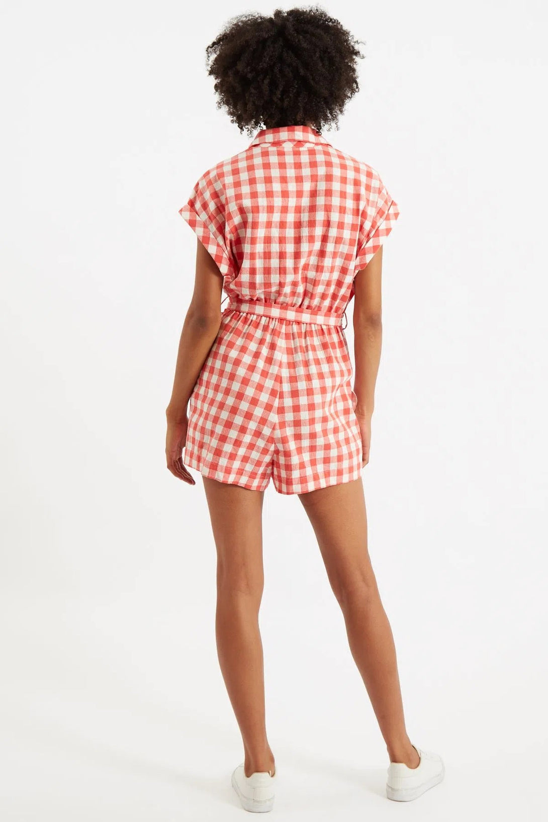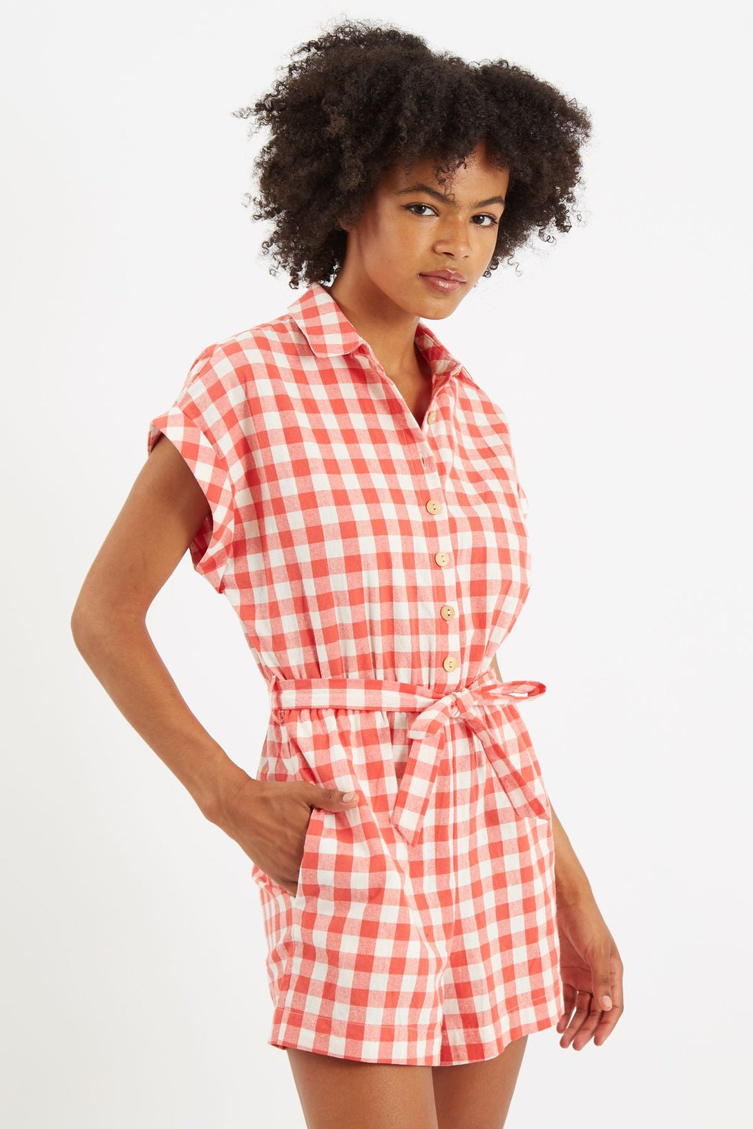 Crafted in a 100% cotton woven check this 50's inspired playsuit has cuffed sleeves an elasticated waist and self tie. Just add your favourite cross body bag and some trainers for that laid back summer vibe.