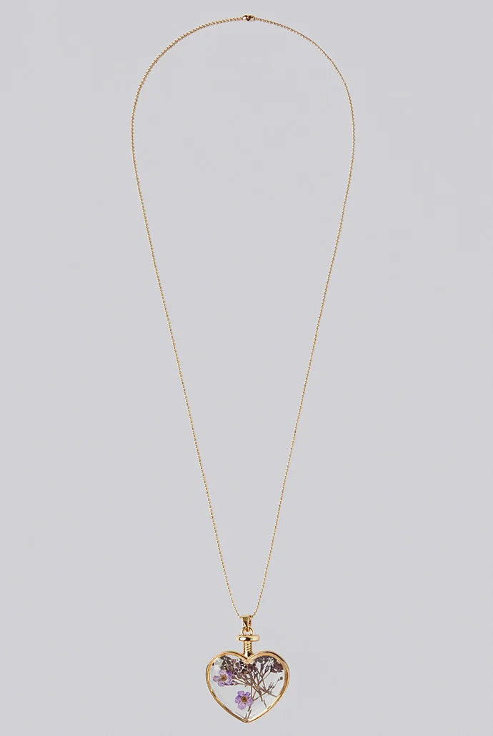 Suspended from a fine chain, the Adina necklace features a heart shaped glass frame with real dried flowers encased inside, making every necklace truly unique.