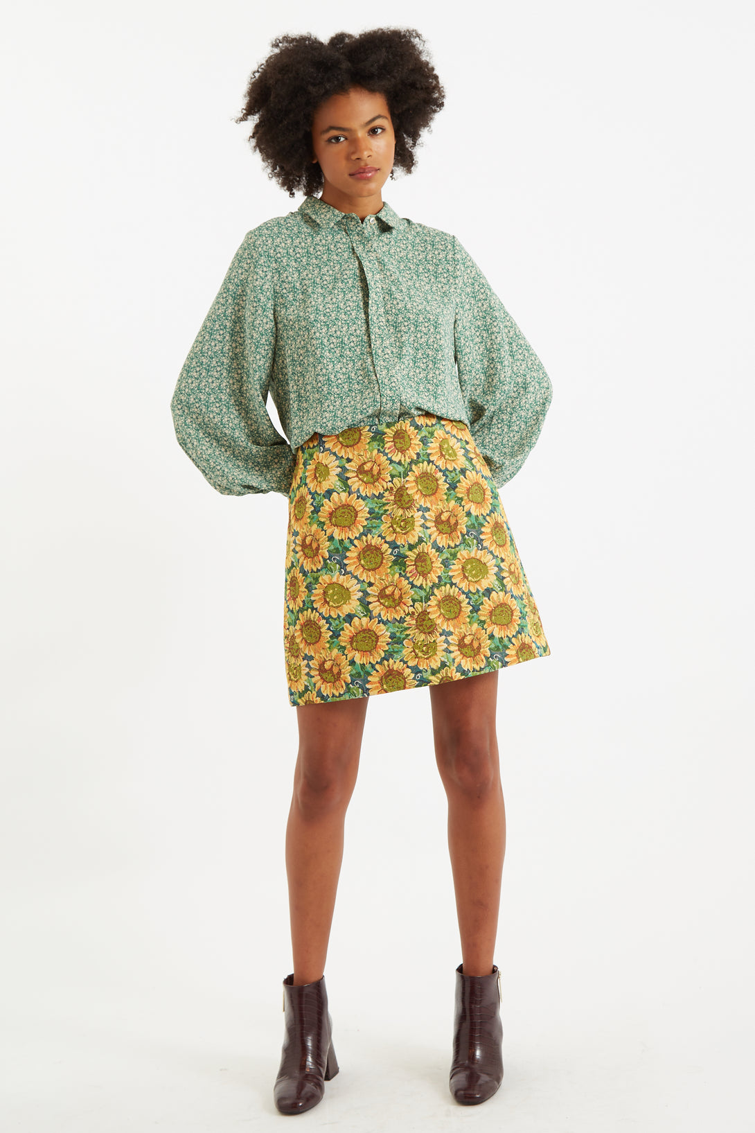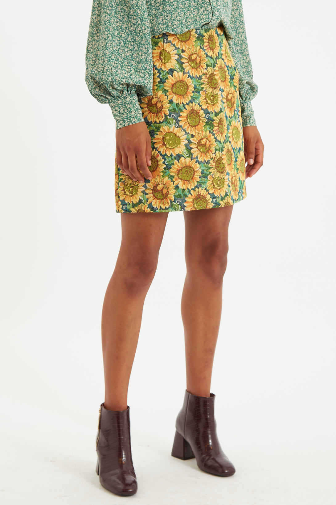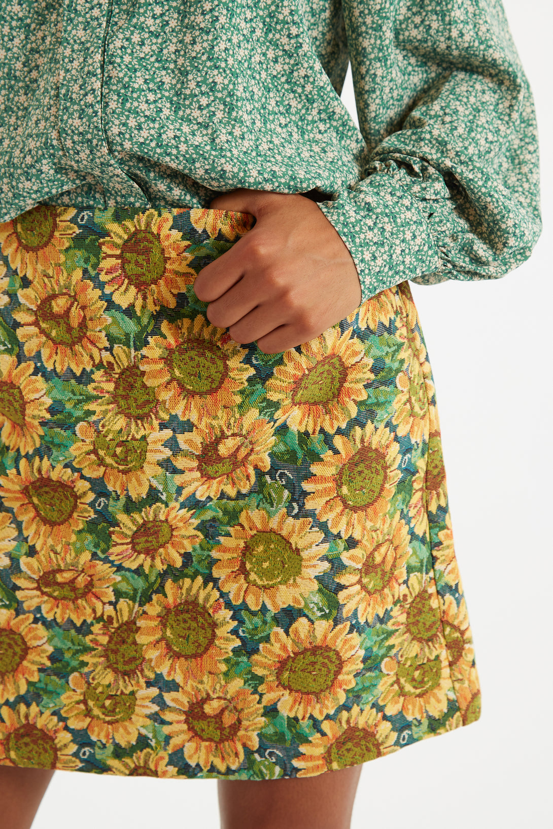 Totally loving this A line mini in a statement sunflower jacquard. Will brighten up your wardrobe instantly. Pair with a wooly jumper in chiller months and a simple tee or shirt as the weather gets warmer.