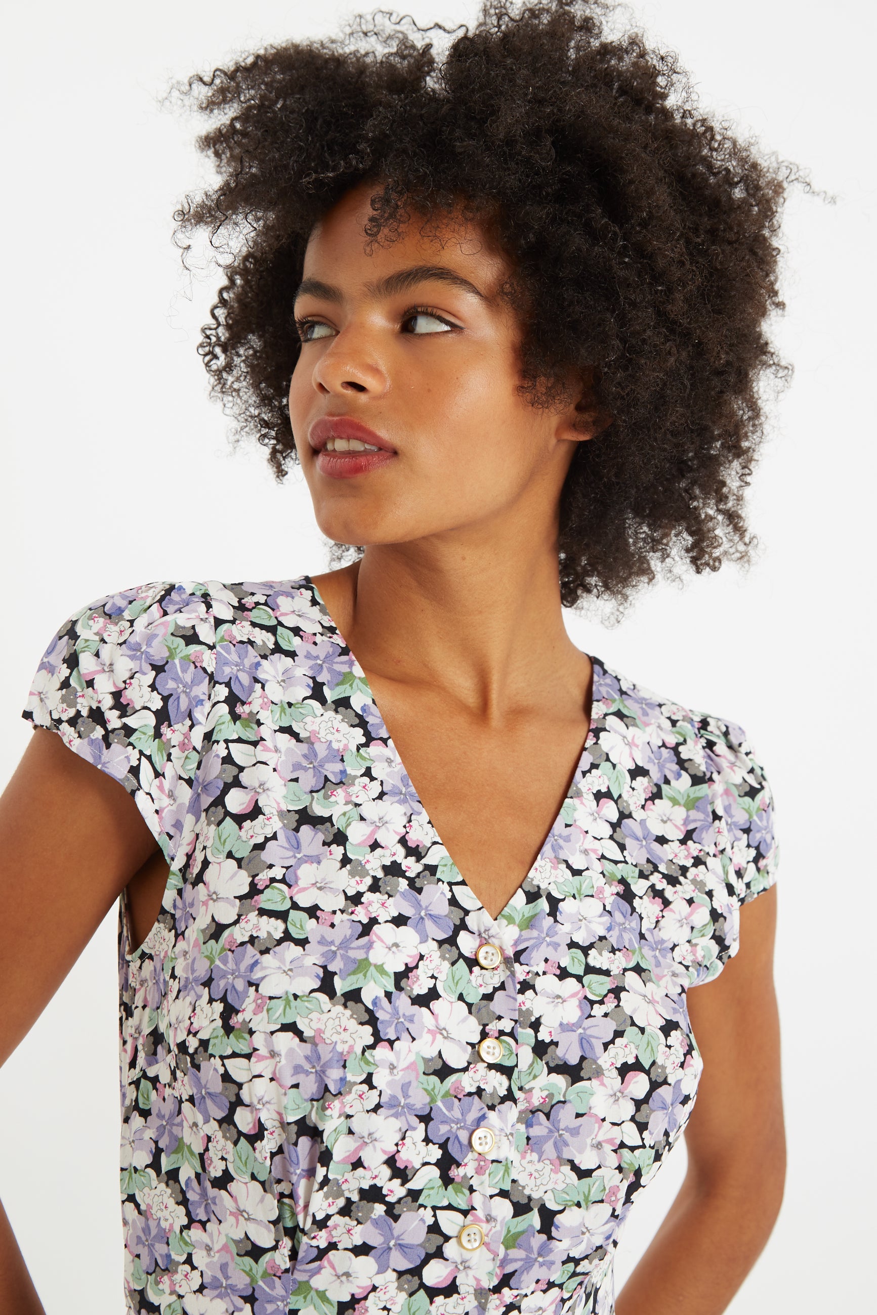 Inspired by a vintage tea dress, our favourite Cathleen dress will serve you well for seasons to come. Crafted in our beautiful flower print, this style is simply the most flattering shape ever. Featuring cap sleeves, a fitted bodice with gold edged buttons, elasticated back waist with tie waist to customise your fit and of course those deep side seam pockets we all truly love. Style with your trainers or sandals and let her be your forever dress.