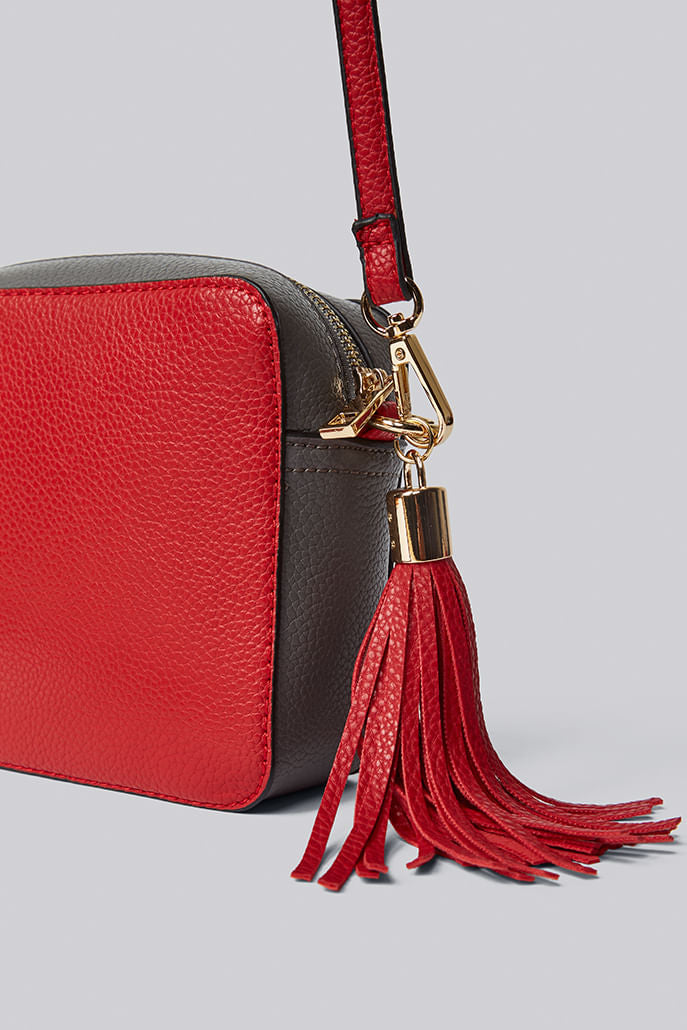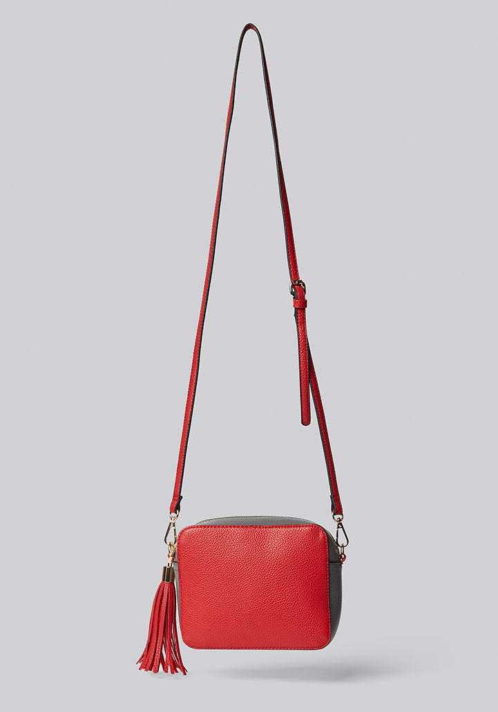 Add a pop of colour with the Daisy. The details of this red and grey contrast panel cross-body camera design include gold hardware, tassel detailing, and useful inner zip pockets. Contrasting black piping features around the strap and side panels.