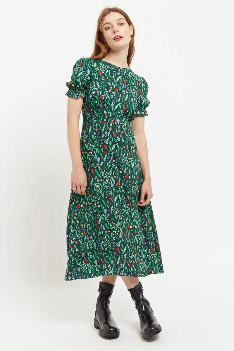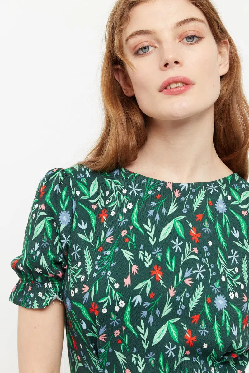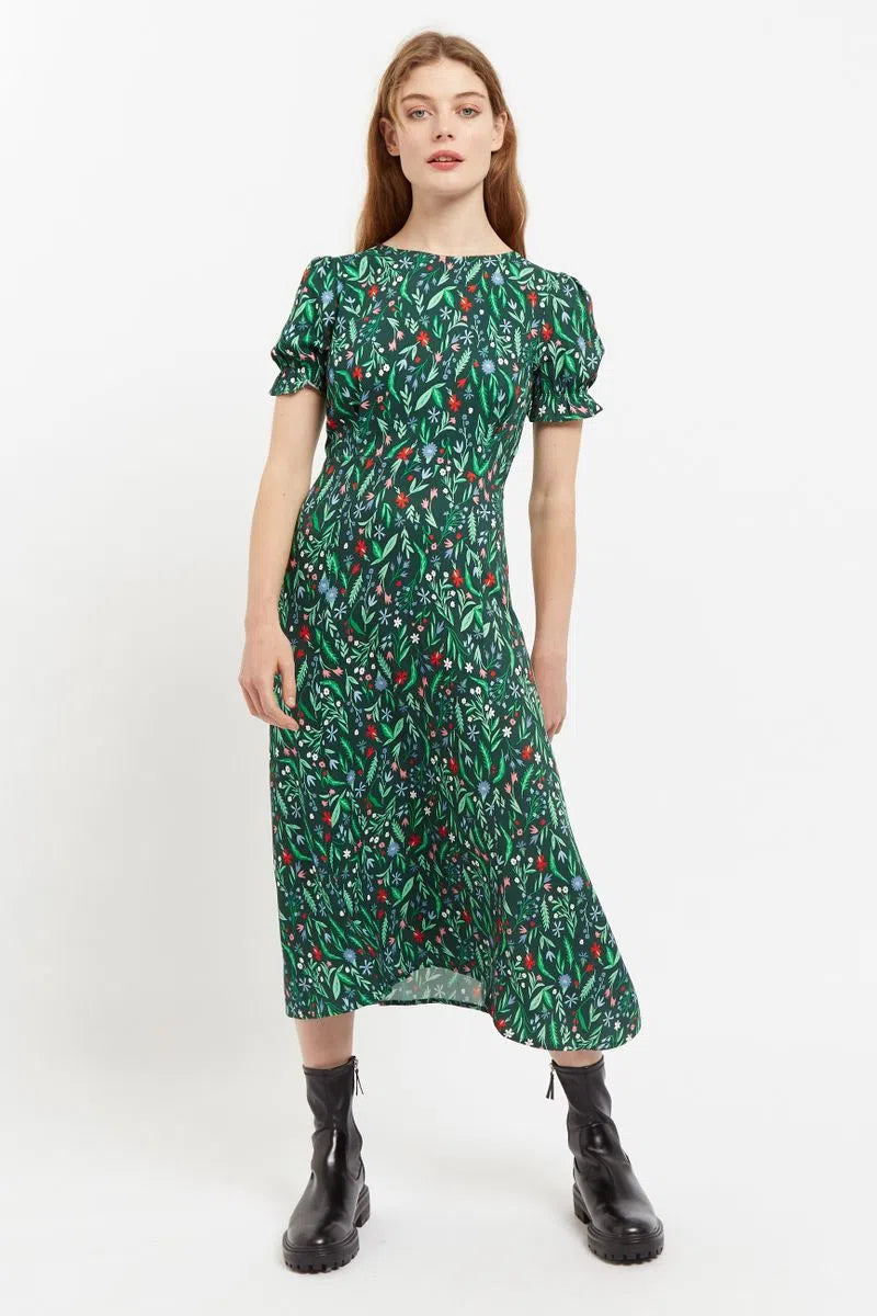 Flo is a dress destined to become your best friend. This season-less dress dark green based floral is printed on a premium viscose twill. Featuring oh so cute puff sleeves with elasticated cuffs and a shirred back panel for flattering perfect fit making it the perfect desk to dinner dress.
