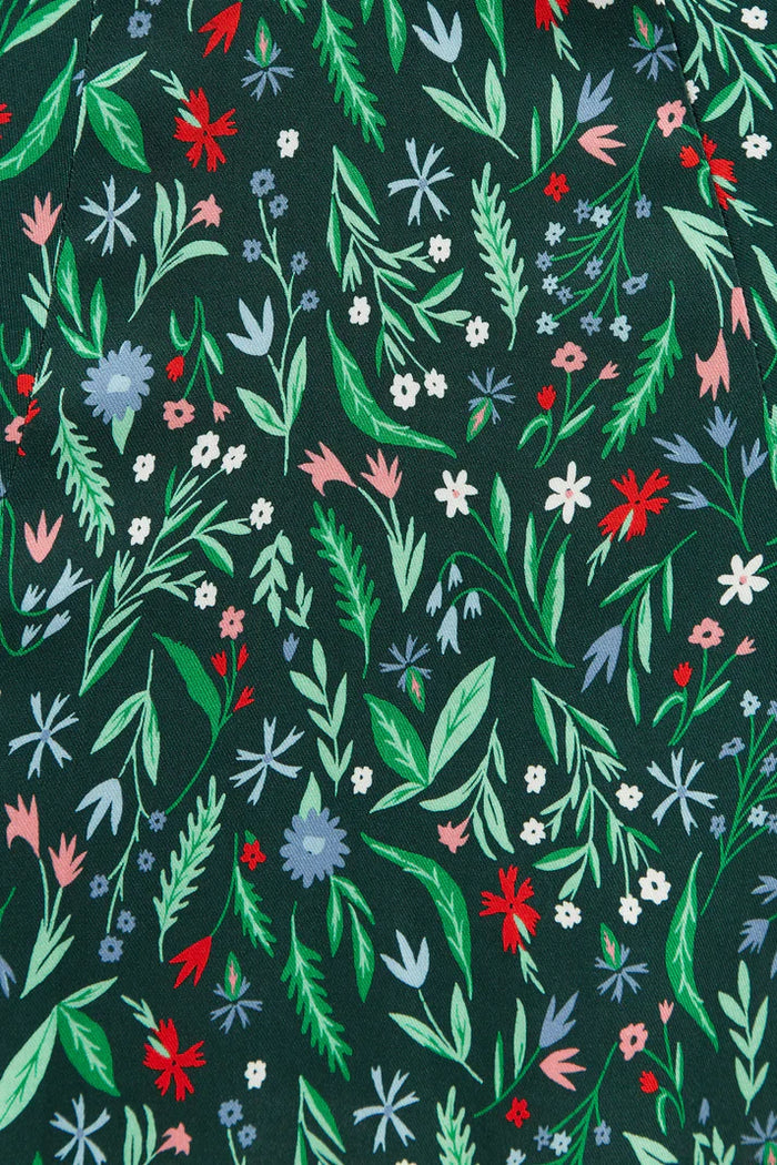 Flo is a dress destined to become your best friend. This season-less dress dark green based floral is printed on a premium viscose twill. Featuring oh so cute puff sleeves with elasticated cuffs and a shirred back panel for flattering perfect fit making it the perfect desk to dinner dress.