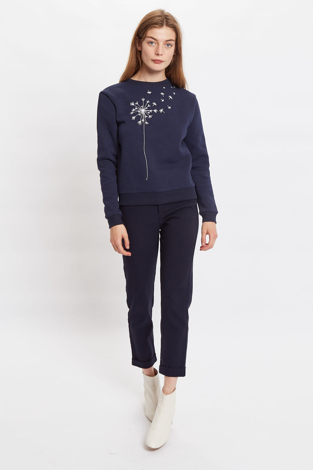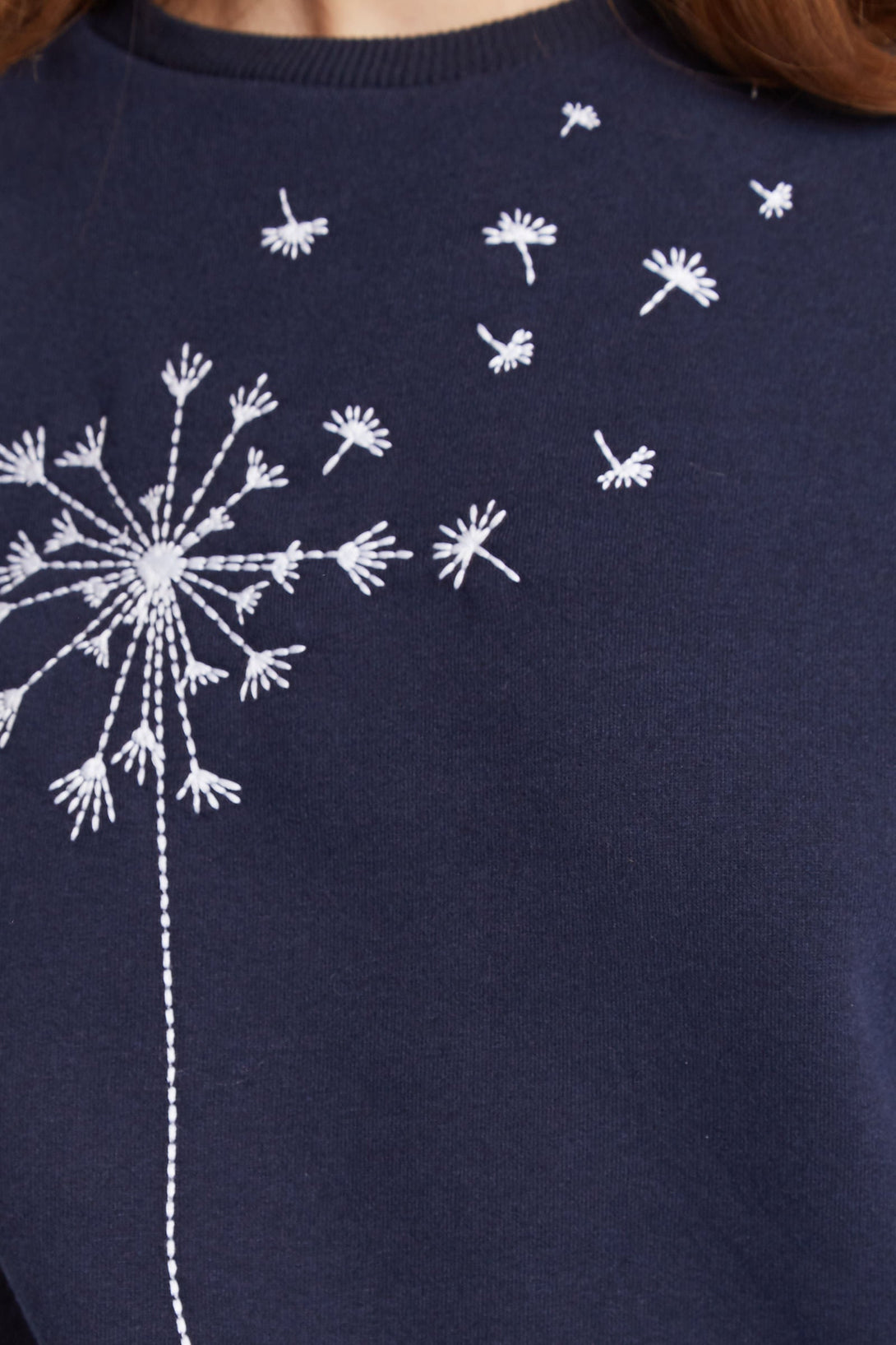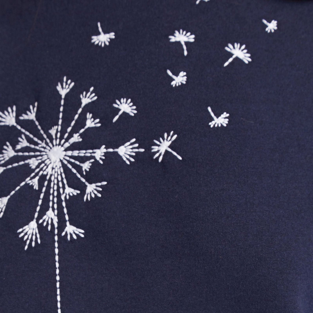 In our signature Jan style, this versatile navy sweatshirt features a stylised dandelion embroidery blowing in the wind, just waiting for you to make a wish upon!