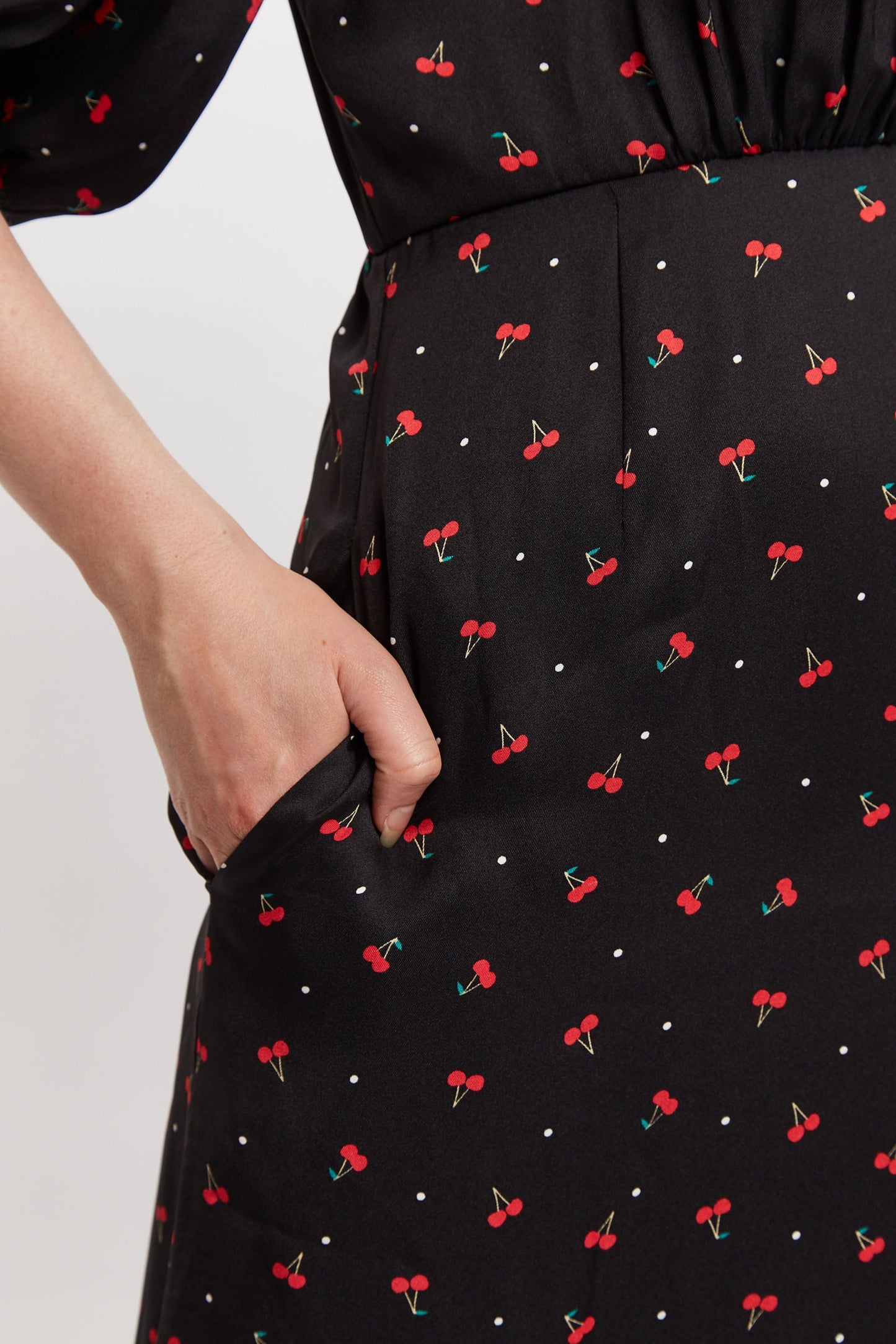 Meet Leonore, she's a dress that definitely wants to be taken out. Crafted in a Matte Satin in our playful cherry pie print. Featuring a slightly high waist, statement balloon sleeves, hip skimming skirt and of course side seam pockets. Wear with your favourite heels for date night or dress it down with your comfiest boots.