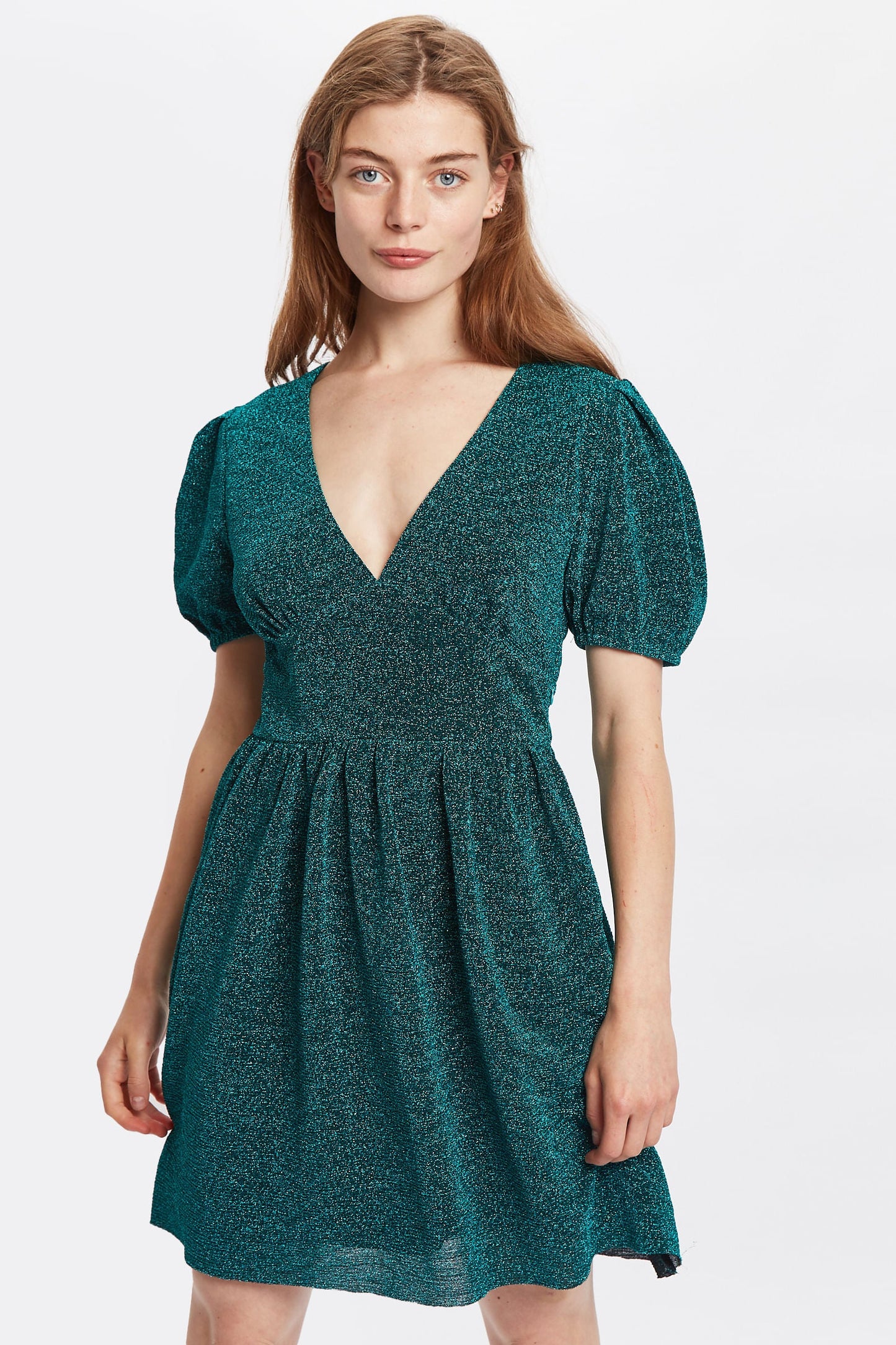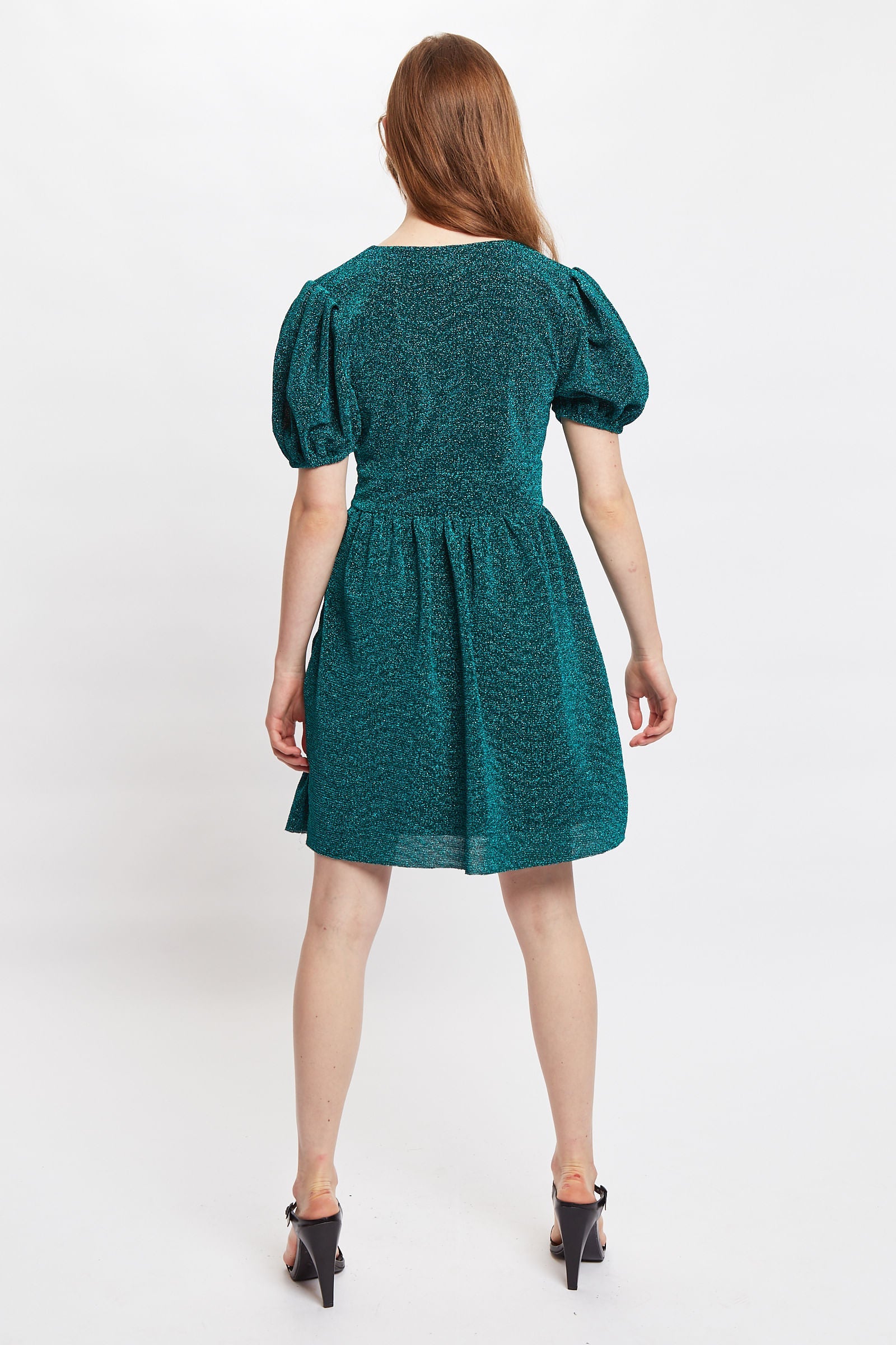 Crafted in a Lurex jersey this mini dress will light up any party . Featuring a deep V neck and statement puff sleeves.