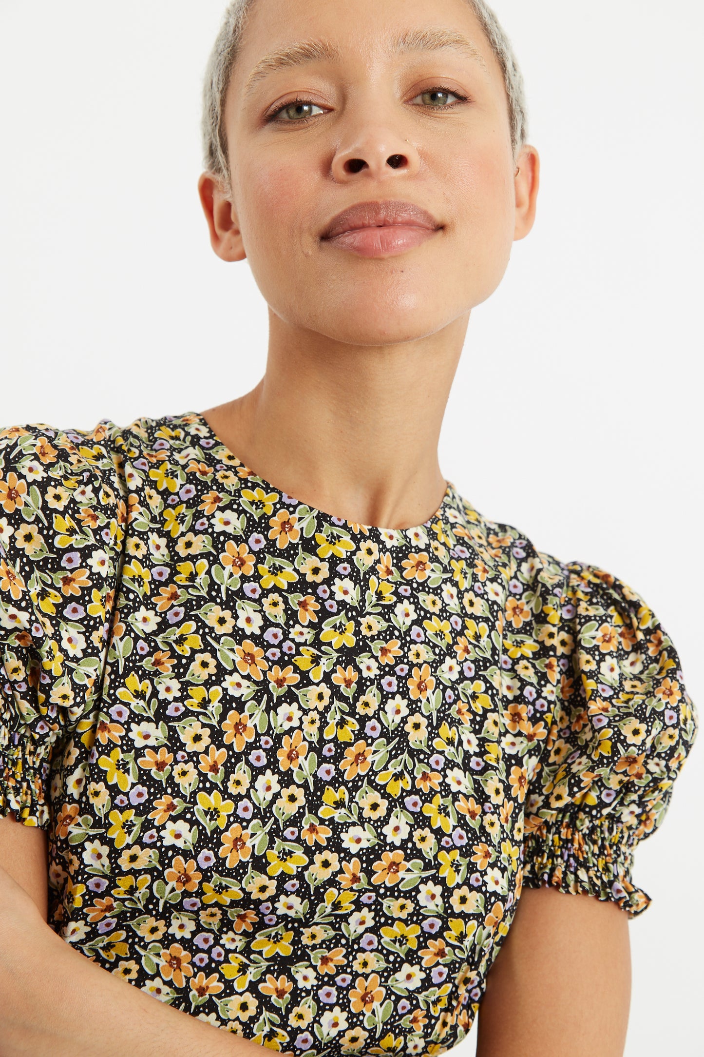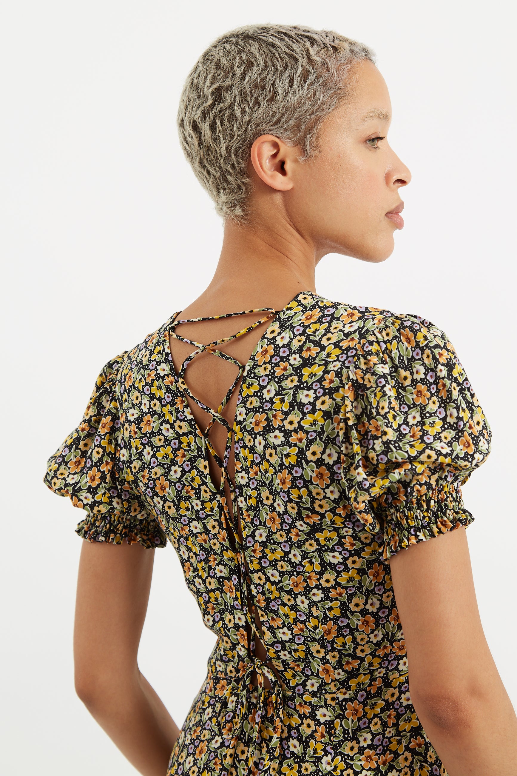 Introducing Romola, a figure skimming midi dress with delicate puff ball sleeves with elasticated shirred cuffs and an incredible lace up statement back for a great fit. Crafted in a ditsy floral print on a black ground, Pair with cowboy boots for a laid back vibe or heels for an occasion.