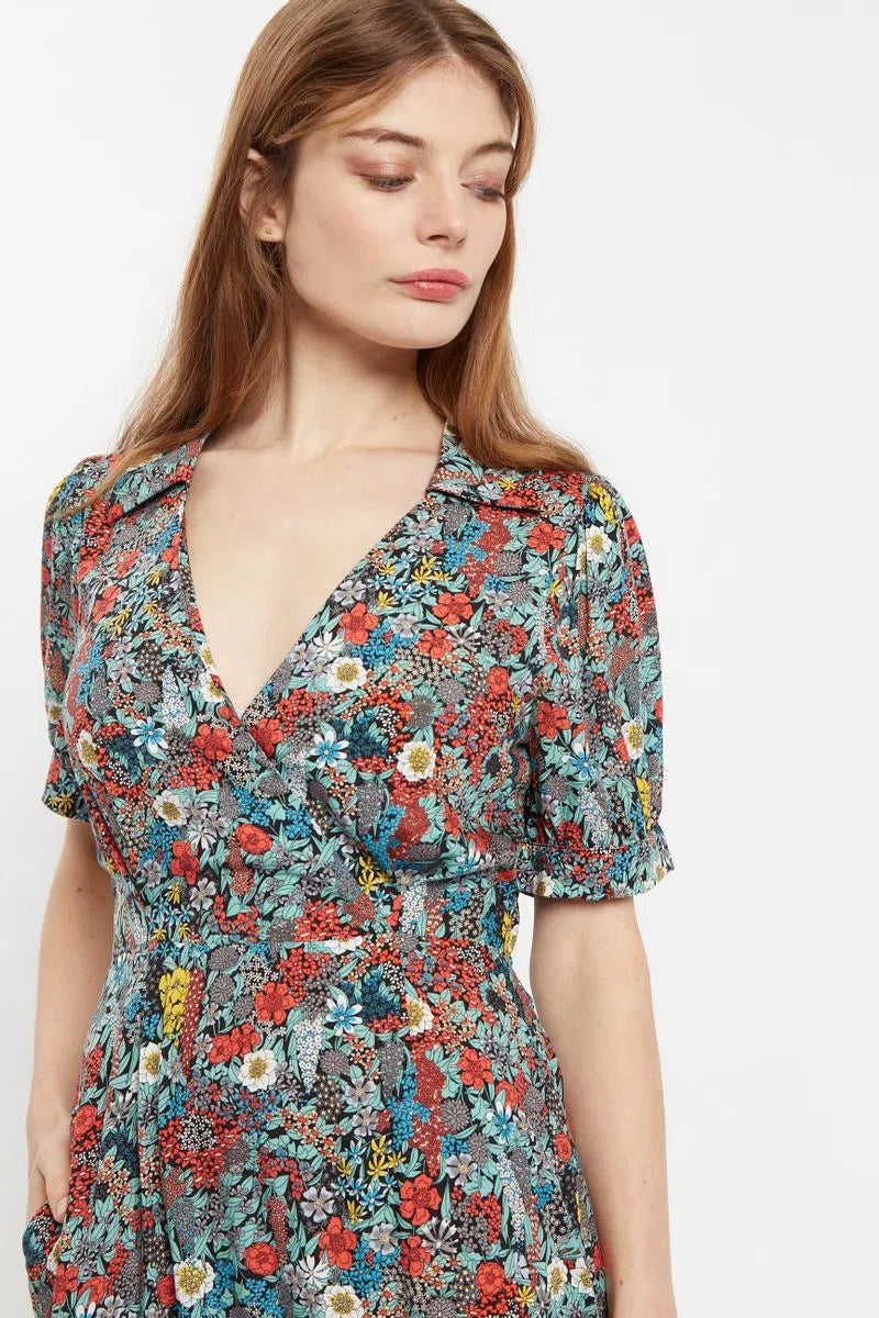 Meet Sakani, a collared V neck midi tea dress. Featuring an elasticated back waist to give definition but maintain comfort, faux wrap bodice detail and of course, side seam pockets. Crafted in our beautiful floret print, this dress, paired with your favourite heeled boots, would be the perfect alternative to create a unique look at a special occasion or dressed down with a comfy pair of trainers for a playful daytime look.