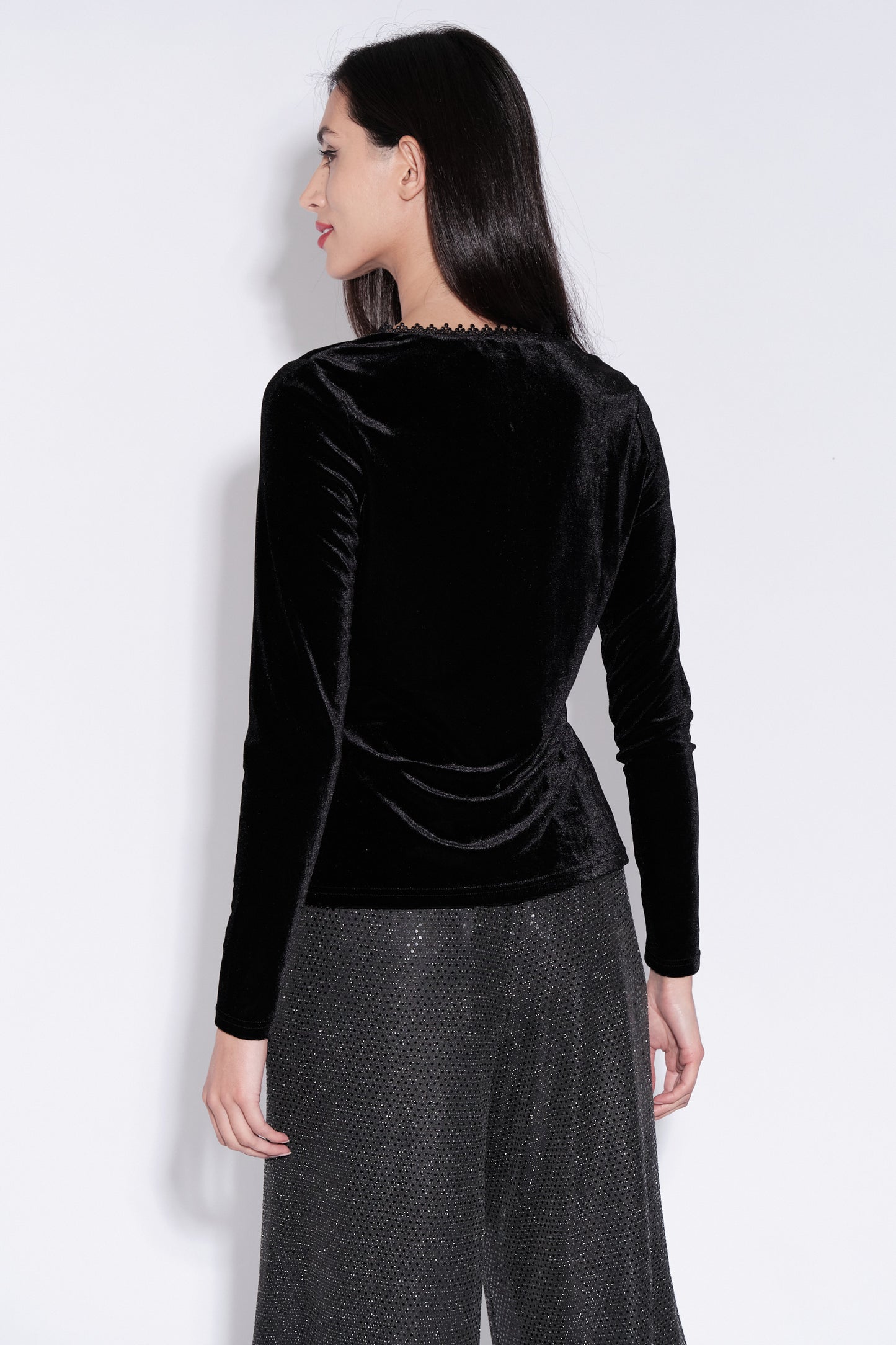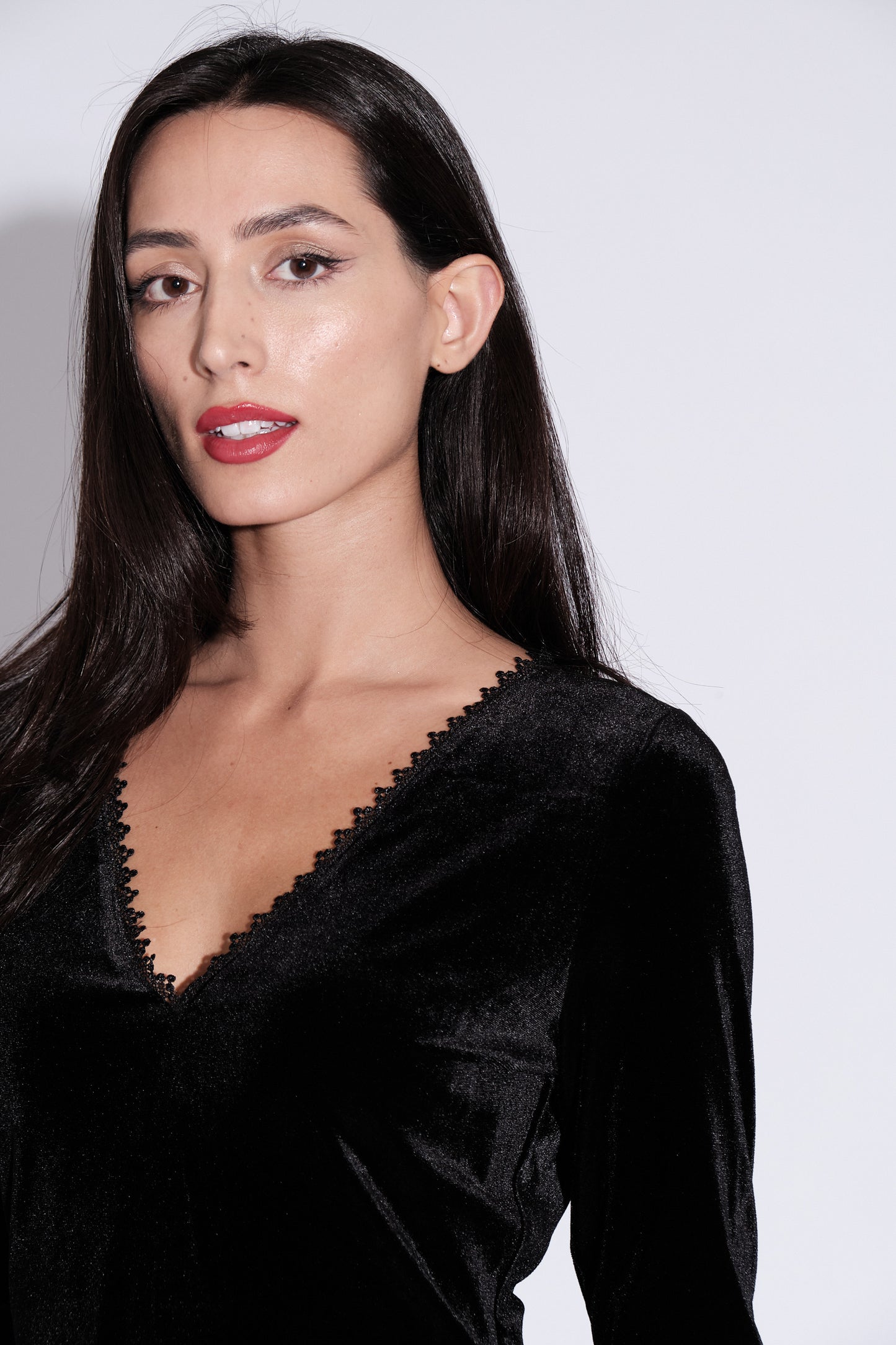 The Maeko velvet V-Neck top in a dramatic black is the perfect addition to any wardrobe! With an elevated, timeless look and a flattering fit that complements all body types, this velvet top is the perfect way to add a bit of luxurious finesse to your look without sacrificing an ounce of style.
