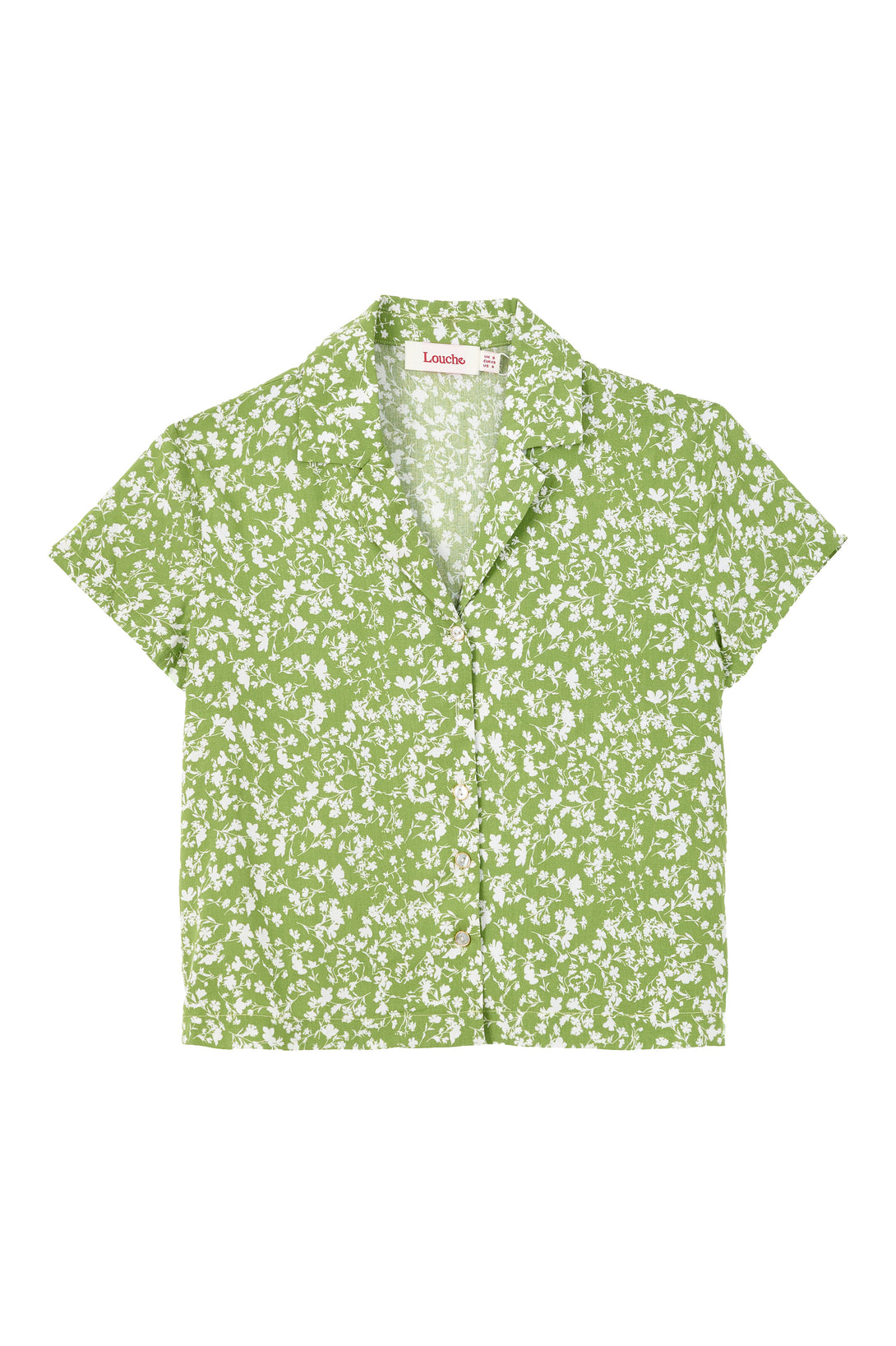 Unleash your summer holiday vibes with our Marika negative floral Kiwi green ditsy print resort shirt! This vintage style shirt is slightly cropped ideally worn out. Paired with our Tilde trousers or Hilton Linen mix shorts in natural.