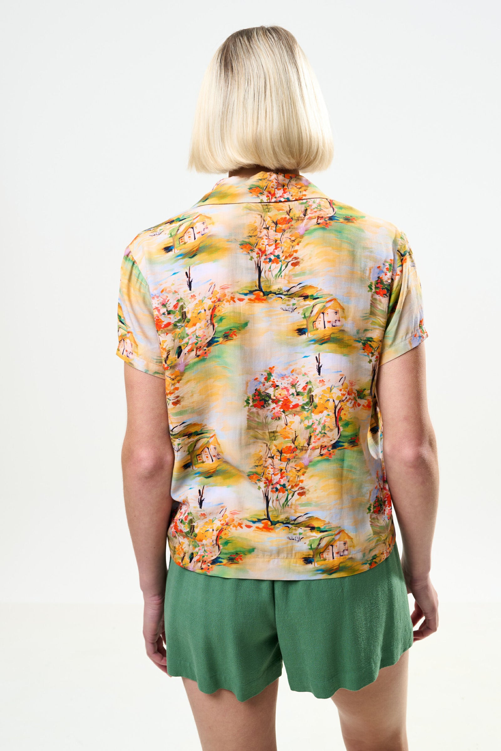 Unleash your summer holiday vibes with our Marika Oriental Landscape print resort shirt! This vintage style shirt is slightly cropped ideally worn out. Paired here with our Hilton shorts.