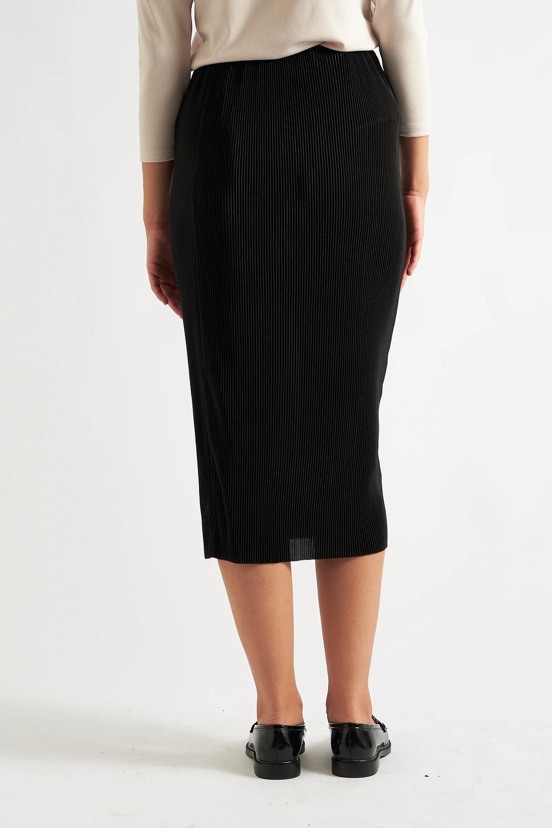 The Maylis permanent pleated midi skirt in black offers effortless style and comfort with its elasticated waist. Perfect for any occasion, this versatile pencil skirt will soon be a staple in your wardrobe.