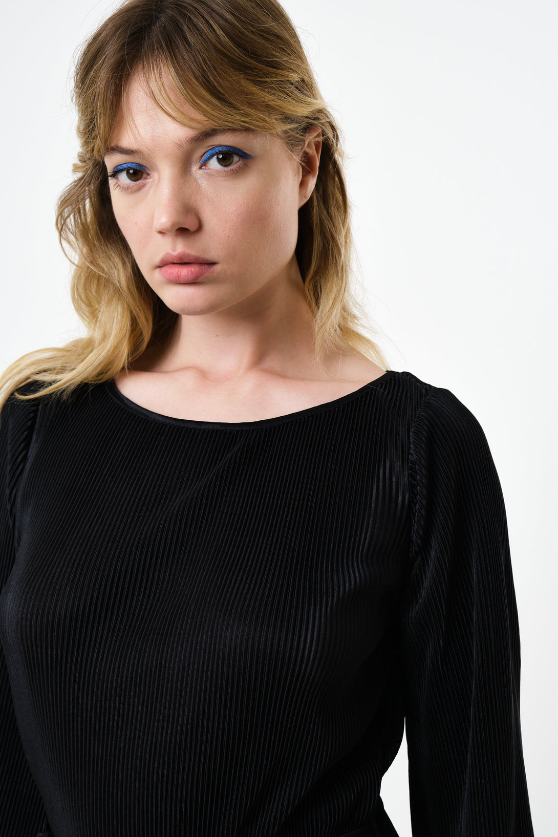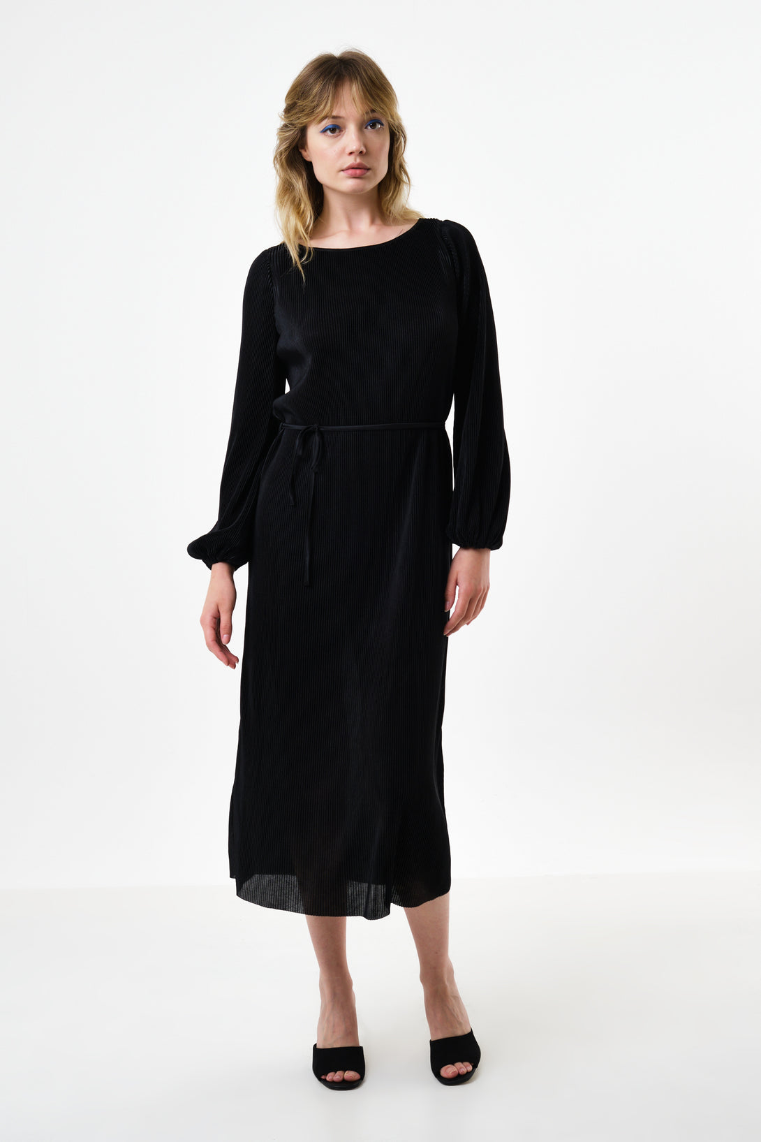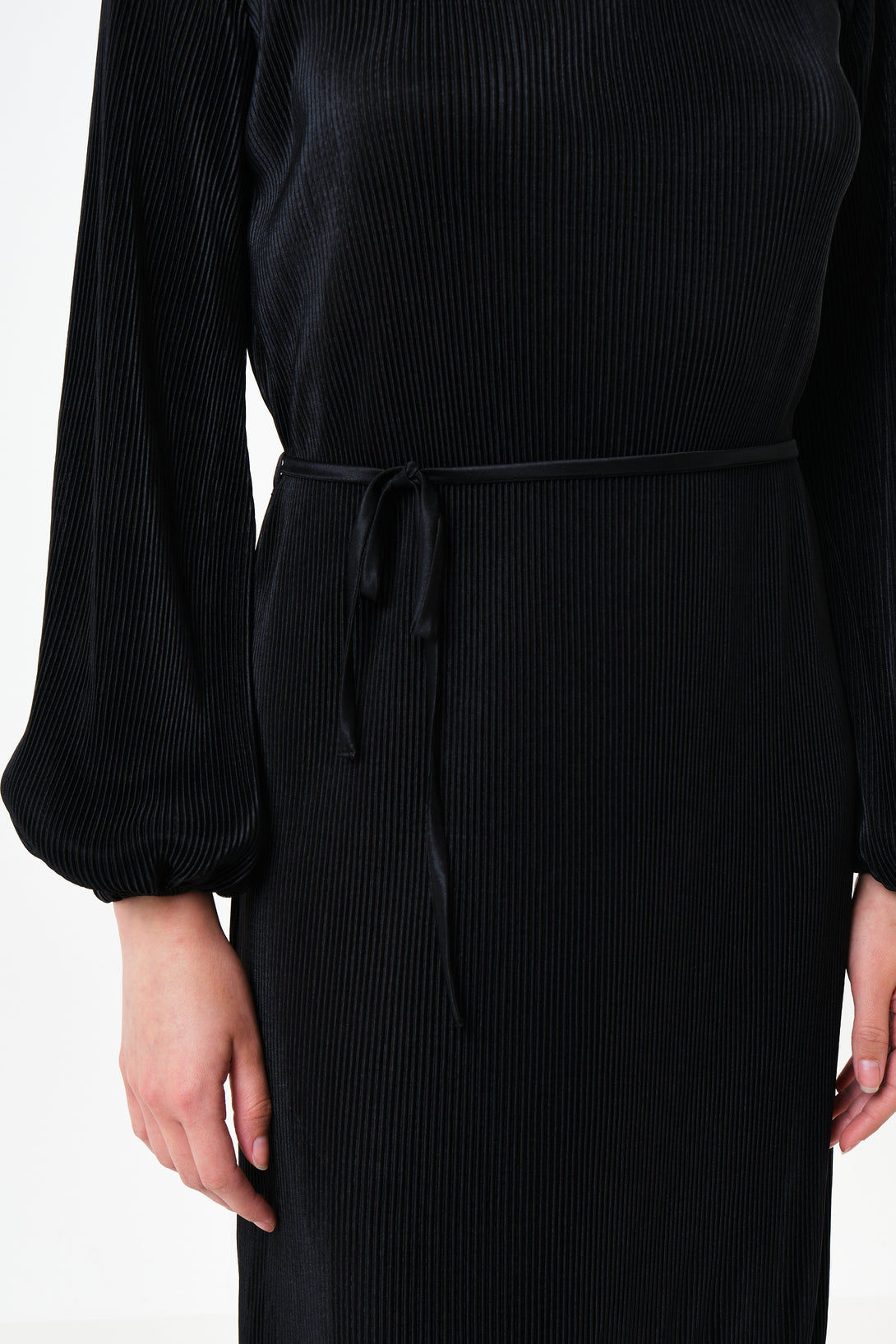 Milene is a simply stunning black midi dress, crafted in permanent pleated easy-care fabric. The column silhouette and billowing sleeves have something of a 70's retro vibe. Elevate your style with this unique and sophisticated piece.
