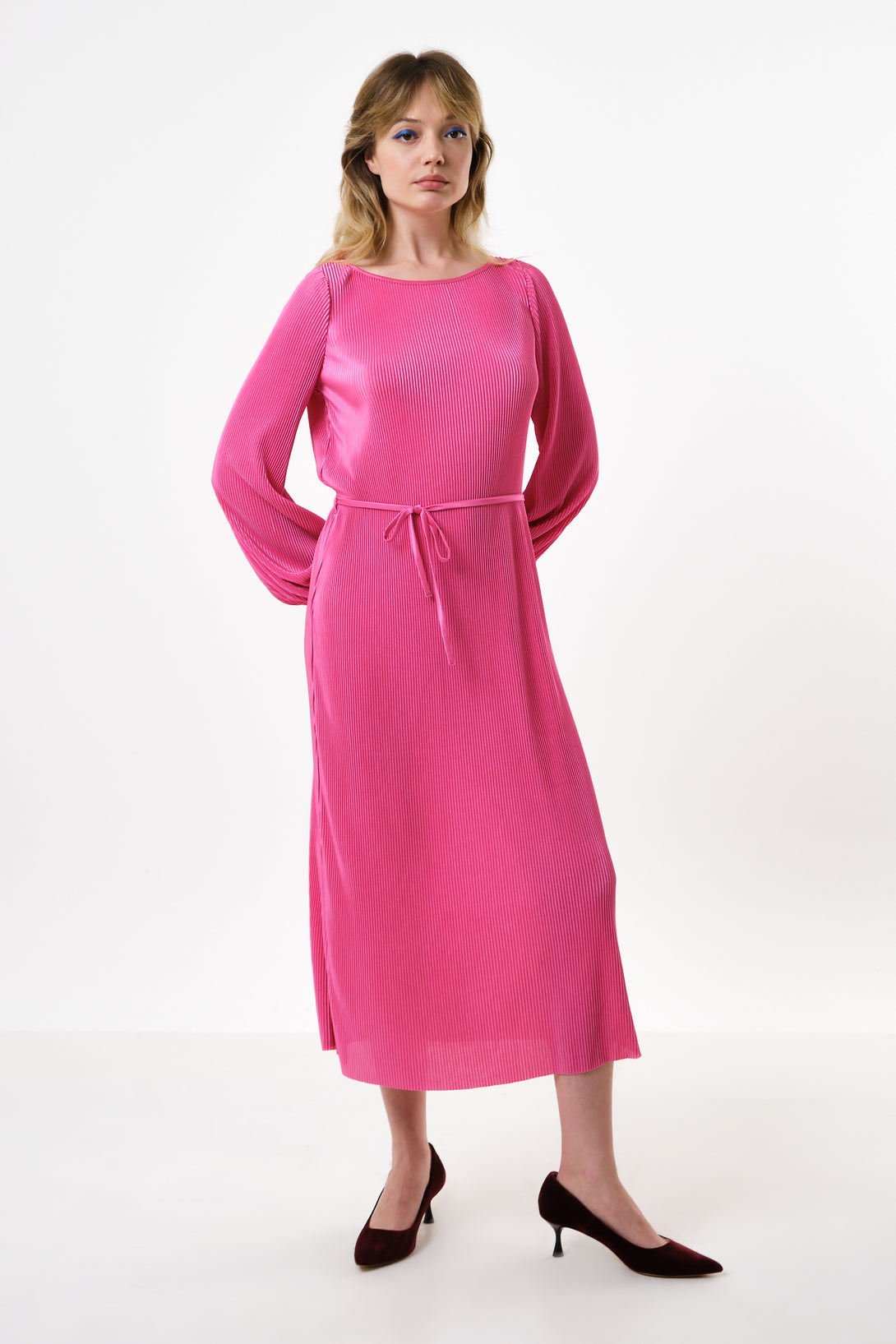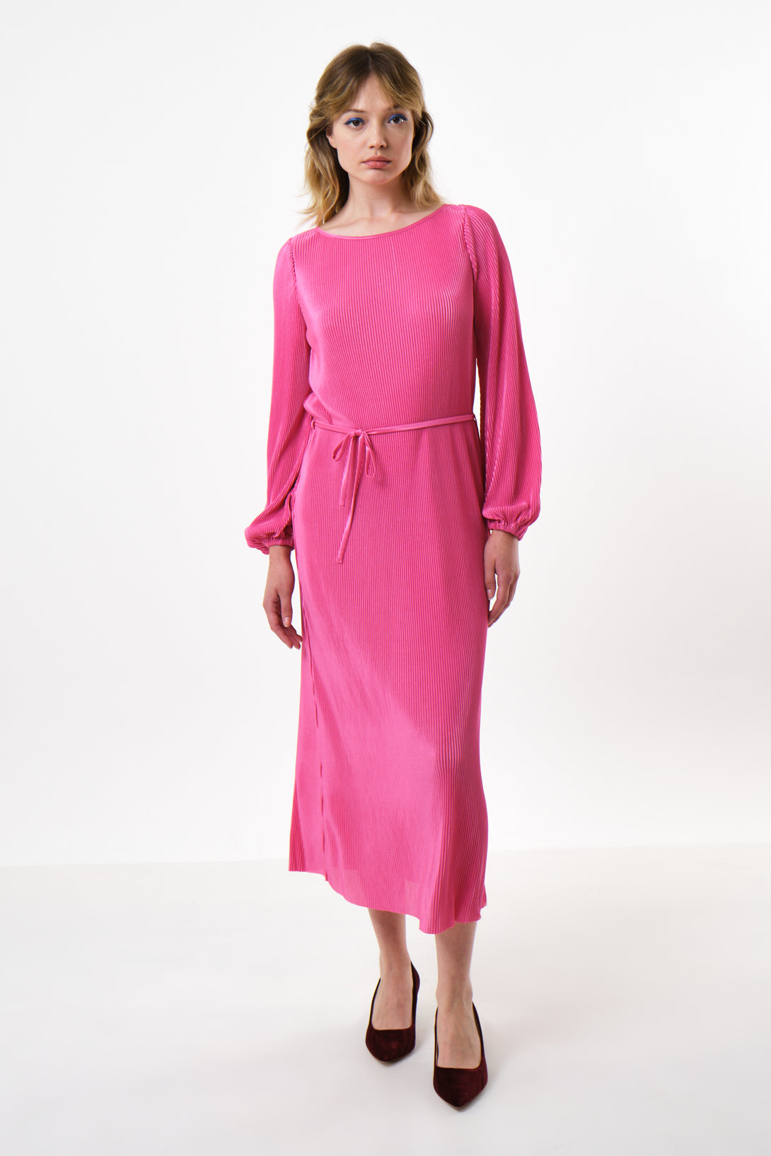 Milene is a simply stunning dopamine pink midi dress, crafted in permanent pleated easy-care fabric. The column silhouette and billowing sleeves have something of a 70's retro vibe. Elevate your style with this unique and sophisticated piece.