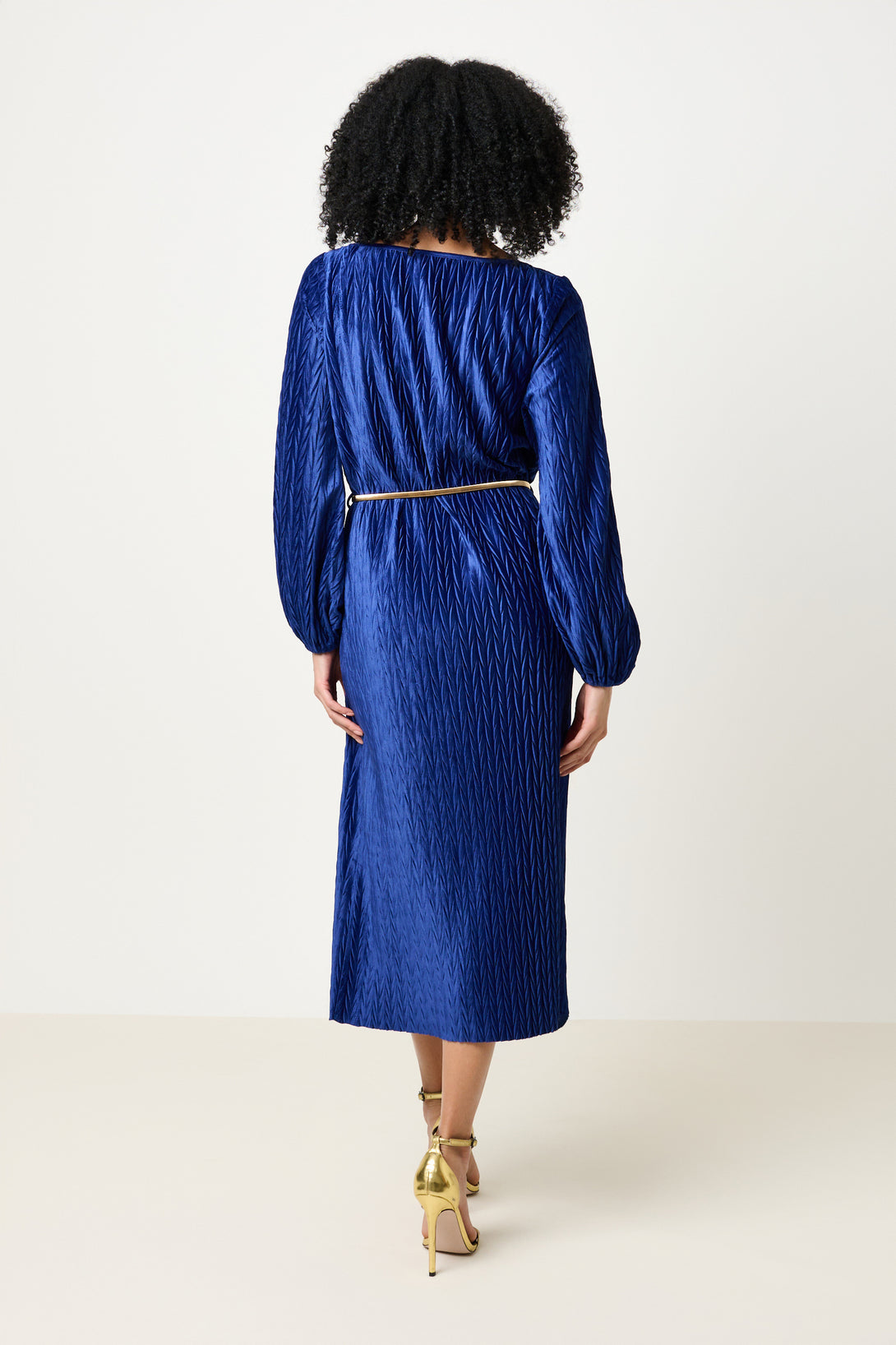 Slip into disco-inspired elegance with the Milene Velvet Pleat Midi Dress. This stunning cobalt blue column dress features voluminous Studio 54-style sleeves finished with elasticated cuffs The dress arrives complete with a retro style elasticated gold leaf belt that cinches the waist and adds a touch of added glamour. Perfect for making a statement at evening events or when you're craving that retro-luxe vibe.