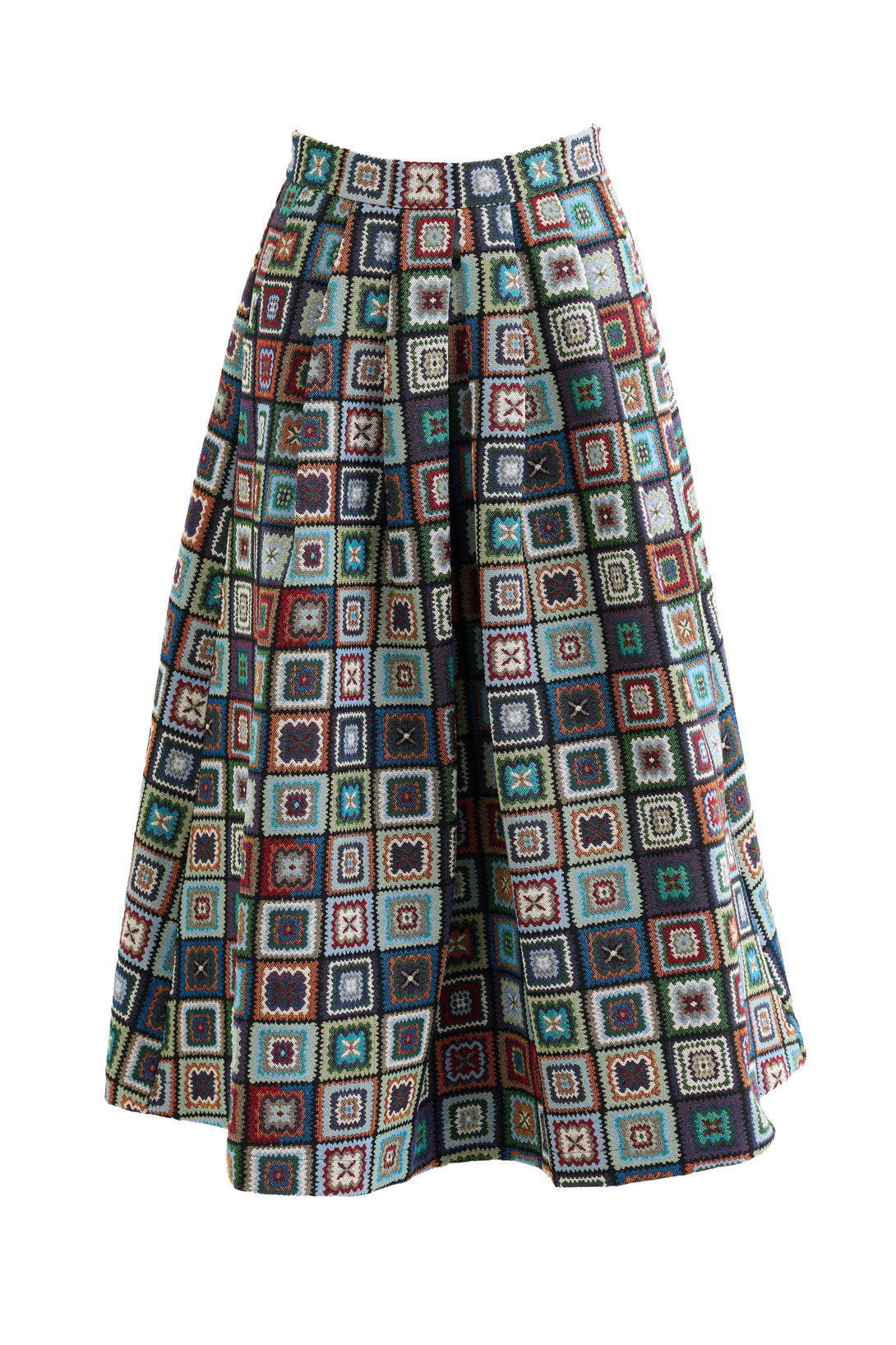 Bring vintage drama to your winter wardrobe with this sweeping, heavy 70’s style, multicoloured, jacquard patchwork midi skirt. This colourful skirt is the perfect statement piece to turn heads and lift your seasonal style.