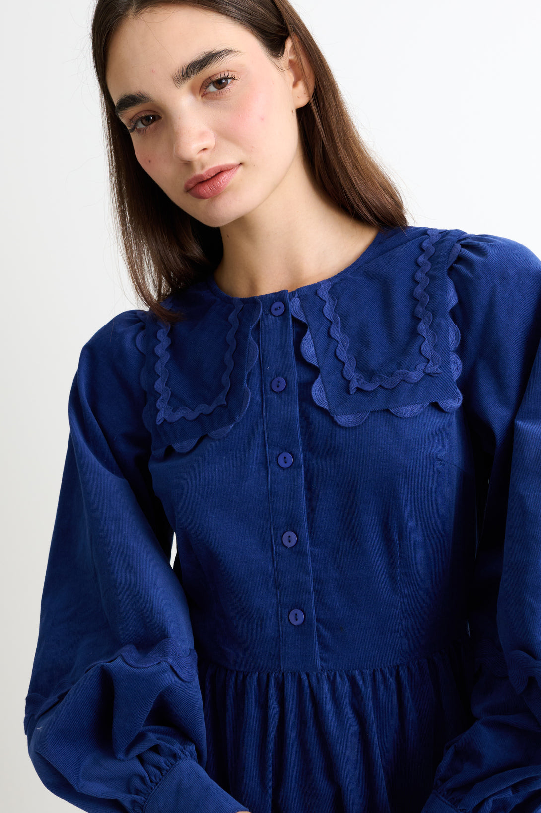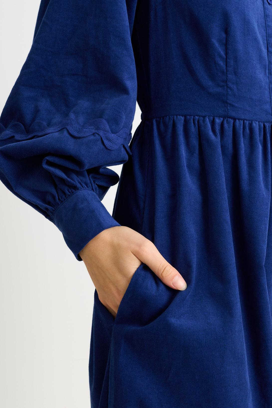 Prudence Babycord Big Collar Ric Rac Trim Midi Dress - Navy