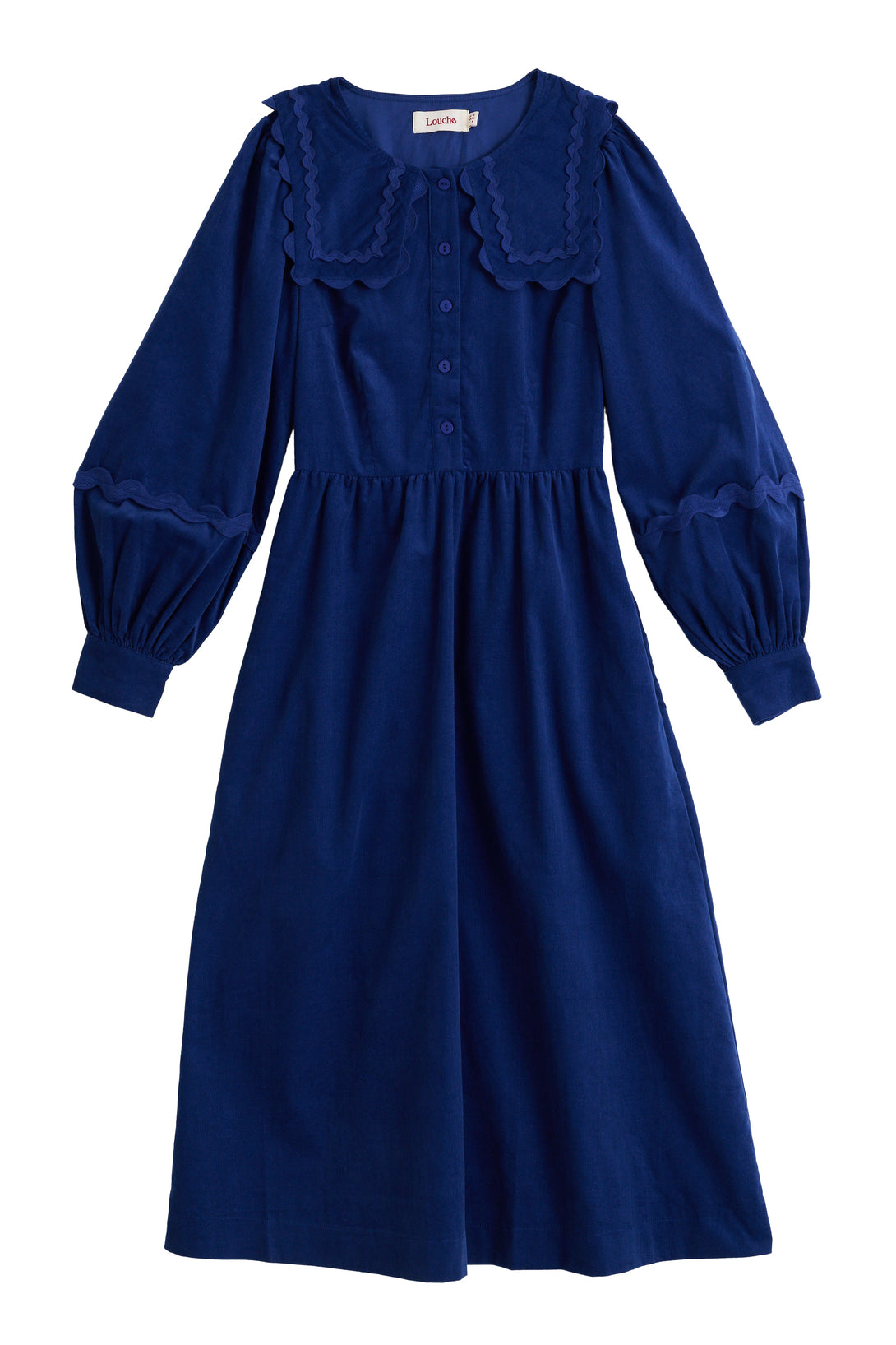 Embrace the new season with the Prudence baby cord midi dress in deep navy. This dreamy winter dress features soft baby cord fabric, a bold sailor-style collar, and playful wide sleeves—all trimmed with a whimsical ric rac trim. Perfect for standing out while staying snug, it adds a touch of vintage fun to your chilly-season wardrobe.