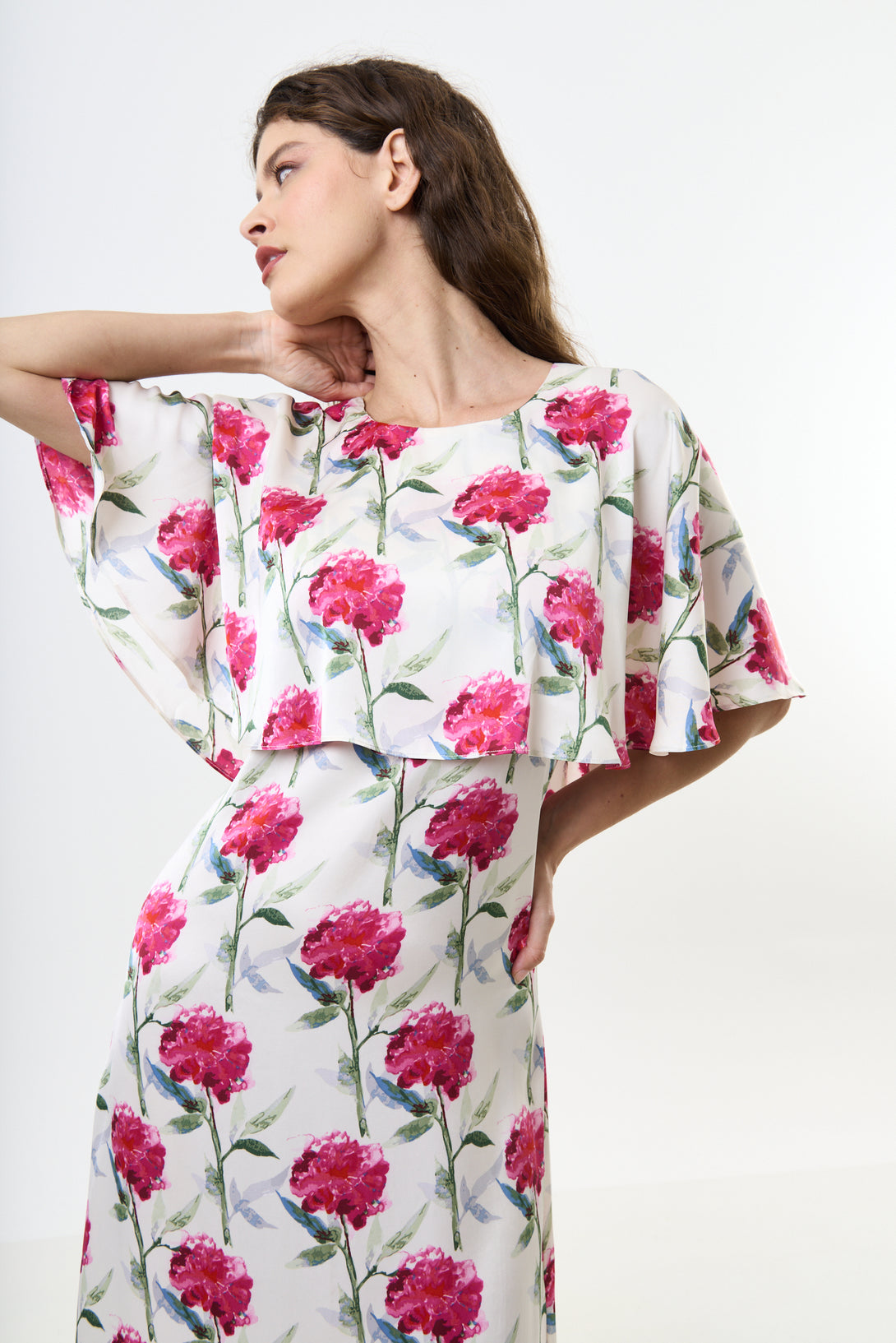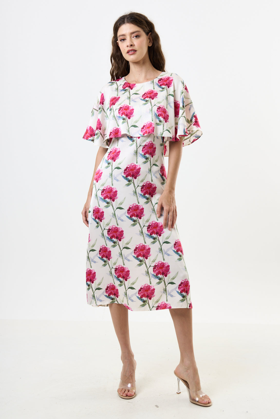 Introducing the Rosso Loveflower print cape top midi dress. Perfect for any special occasion, this elegant dress features a stunning cape top and a beautiful watercolour-style peony print on a matte satin fabric.