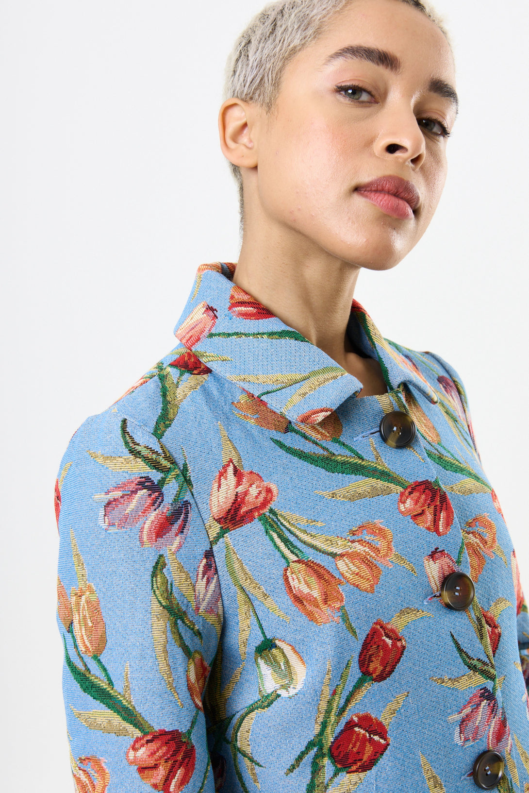 Add some flair to your wardrobe with our Salut Tulip jacquard short jacket on pale blue ground. This neat bracelet sleeve cropped jacket boasts a stunning tulip jacquard design that pairs perfectly with the matching Aubin skirt. Or, for a more casual look, add it to your favourite denim for a new dimension.